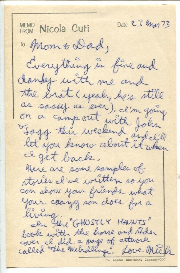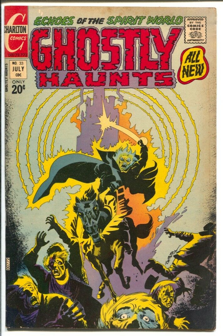 Ghostly Haunts Issue: 33 / Year: 1973 Condition: VF--From The Nicola Cuti collection Includes a signed letter from him to his parents, on original Charlton stationary, describing his work in this comic book -Steve Ditko & Pat Boyette art -Tom Sutton horror cover Higher grade, light foxing on opening side of cover Publisher: CharltonSku: U2-108-400 Over 100,000 mail orders processed! Buy with confidence.