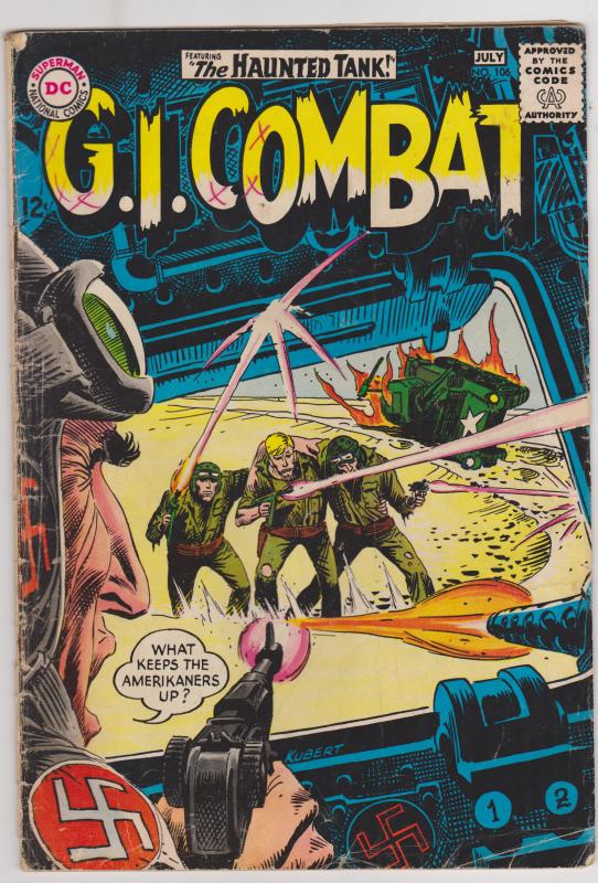 G.I. Combat #106 by DC Comics copyright 1964. I have graded the comic book, using the Overstreet Grading Guide, at GOOD with the following defects: Light and moderate stress marks along the spine. The corners are rounded. There are folds in the upper and lower right corners. There are ink marks in the title. The corners are rounded. There is yellowing of the pages.Seller Information