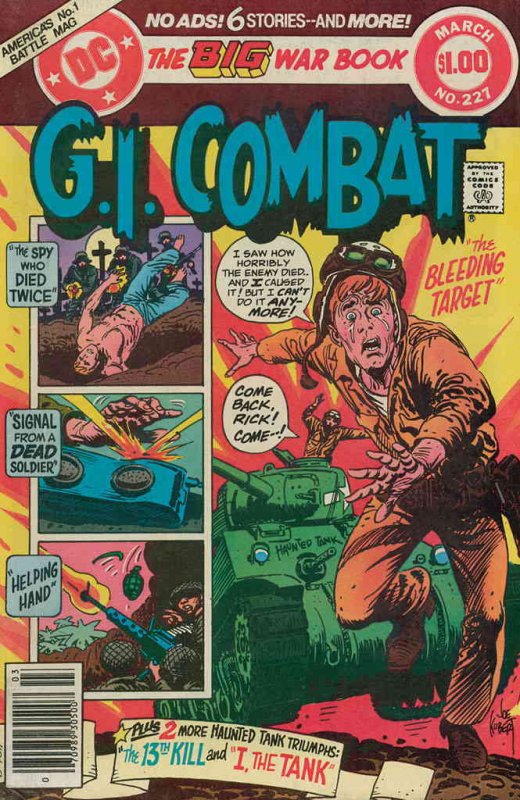 Item: G.I. Combat #227 (Newsstand) | Publisher: DC | Cover Date: March 1981 | Writer: George Kashdan, Robert Kanigher | Artist: Dick Ayers, Jun Borillo, Sam Glanzman | Cover Artist: Joe Kubert | Storylines: The Haunted Tank: I, Tank; The Spy Who Died Twice!; The Unknown War: Signal From a Dead Soldier | Notes: newsstand edition | With Economy shipping, each additional comic ships for just 50 cents more to customers in the USA. This listing contains a stock photo and information from ComicBase™ and © Human Computing. The stock photo is for reference only. If you would like to see a photo of the actual item, please message us prior to purchasing.Seller Information