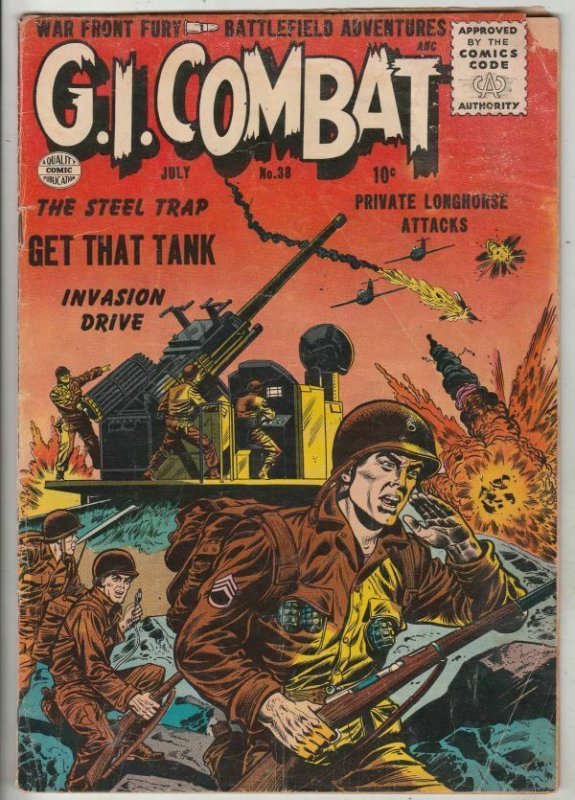 Condition:This book has deep rich color and decent eye-appeal with a chip out at the upper-outer tip of the front cover. There is a long thin tape-seal inside the back cover up from the base. We have adjusted the grade accordingly. There is a small split at the base of the spine."The Steel Trap"`"Get That Tank!"`"Invasion Drive"`"Private Longhorse Attacks!";;Content;;East/West Berlin Spy Story!;;Content;;Korean War Story!;;CONTENT - East/West Berlin Spy Story!CONTENT - Korean War Story!