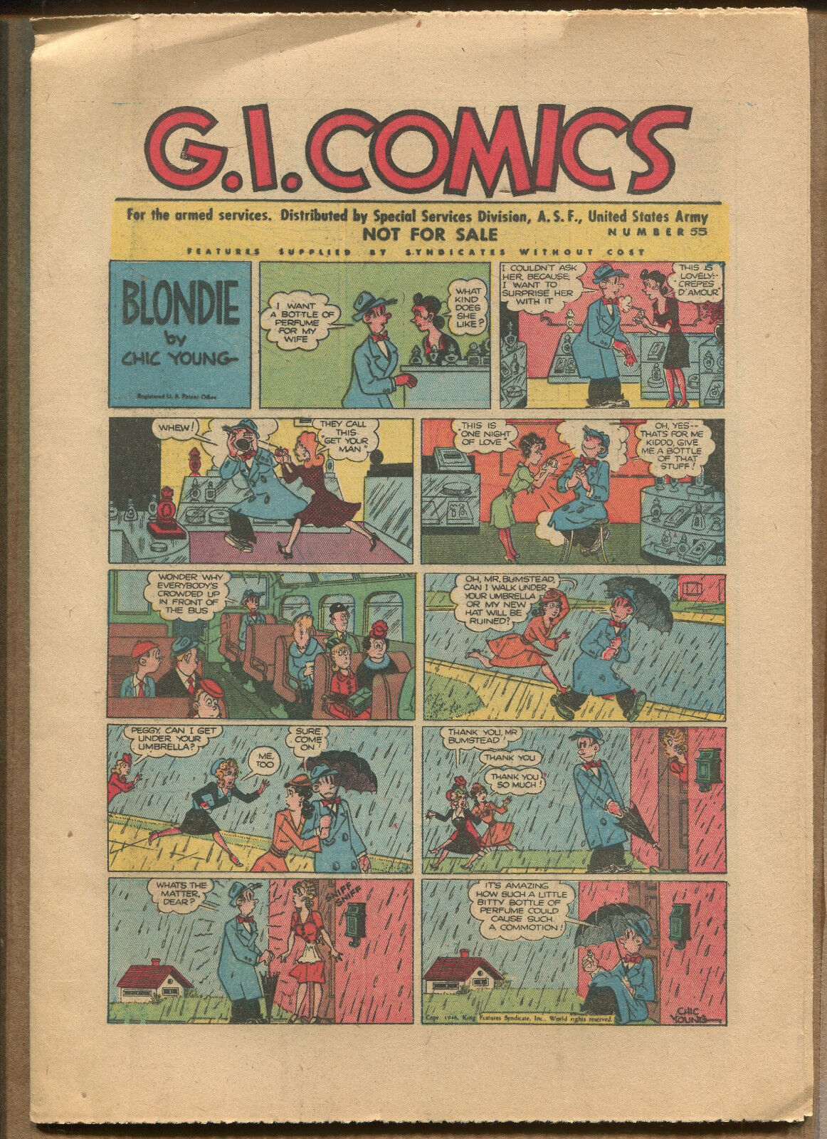G.I. Comics #55 - Blondie Chic Young - (Grade 8.5)Frequently Asked Questions: What is your base shipping for raw comics?Our base ship method will be in a media box, media mail for $5 domestic. If it says expedited $5.60 that’s a typo! Base shipping price you see is for your item to be shipped very well in the appropriate box. We spend money on these boxes to protect during shipping so you can be confident your item will arrive securely. What is your base shipping for CGC comics?Domestic for CGCs are $10 for the first and $5 for each additional one you add.Do you combine shipping? Yes, of like items. Such as: several comics can fit in one media box, as can more than one record. Multiple art pages can easily be combined because they are light and thin. Where combined shipping differs is with size and weight. For instance, two statues require a much bigger box. Same goes for CGCs, as the package gets bigger and heavier as you go.Do you ship well? I’ve had some bad experiences… You needn’t worry; we are professionals who value your business and want your item to arrive safely as much as you do. I have been collecting for over 30 years. I send out items the way I would like to receive them. What does WH mean? We operate out of two locations, so WH stands for Warehouse, an internal code for us to know which location the item is in.Have these CGCs had any previous owners? No. I have personally sent in almost all of these to CGC and had them returned to me, offering them fresh to the market for the 1st time. I see the word STAT when describing the art page I’m interested in. What’s a STAT? A STAT is essentially a photocopy glued on to one or more of the panels by the artist done during production of the piece and is not original artwork. We will do our best to clearly identify what’s a STAT or what isn't on your page, if indeed it contains one.I changed my mind after successfully winning the auction or fixed price listing, will you cancel the transaction? Please only bid or hit BUY IT NOW if you are willing to follow through and pay for the item, we will not cancel the transaction. As a seller, Hip penalizes us every time we cancel an order, so it is detrimental to our business to do so. Therefore if you will not pay, then you'll have to let Hip cycle this to an “unpaid item” and accept whatever action Hip deems necessary. How do you grade? 10.0 GM Gem Mint 9.9 M Mint 9.8 NM/M Near Mint/Mint 9.6 NM+ Near Mint+ 9.4 NM Near Mint 9.2 NM- Near Mint- 9.0 VF/NM Very Fine/Near Mint 8.5 VF+ Very Fine+ 8.0 VF Very Fine 7.5 VF- Very Fine- 7.0 FN/VF Fine/Very Fine 6.5 FN+ Fine+ 6.0 FN Fine 5.5 FN- Fine- 5.0 VG/FN Very Good/Fine 4.5 VG+ Very Good+ 4.0 VG Very Good 3.5 VG- Very Good- 3.0 GD/VG Good/Very Good 2.5 GD+ Good+ 2.0 GD Good 1.8 GD- Good- 1.5 FR/GD Fair/Good 1.0 FR Fair 0.5 PR Poor Grading is VERY subjective, i try to grade items as best i can but use the pics as a guide for yourself and if you still have any questions send an email. Happy Bidding!We use the comic book grading system (link below) for almost all of our auctions, please refer to this chart and look at the pictures to decide for yourself if the grading is to your liking and agreement (if you notice any glaring omissions please contact us, our goal is 100% customer satisfaction). will be graded accordingly to the best of our abilities so unless the item is SEALED please refer to the guide & pictures and decide for yourself. Placing a bid on this item verifies that you agree with the grading we have provided. Happy Bidding!See ABOUT ME for 1000's of original art pages in stockI combine shipping on multiple buys! I combine shipping on multiple buys! See FAQAS SEEN ON TV: I am the Regular Comic Book Expert on Kevin Smith's Comic Book MenSundays at 11:30 pm on AMC (Following the Walking Dead) I have been buying and selling artwork and comics for about 20 years. The artwork pictured are all one of kind originals unless otherwise described. If you are new to buying art feel free to ask any questions that you may have.Anthony is always interested in doing business and answering your questions feel free to call [phone removed by Hip] or e-mail me to let me know what you have. This # is text enabled as well.See ABOUT ME for 1000's of original art pages in stock Small, Regular, and Large Portfolios available; see my Hip store! Froo | Froo Cross Sell, Free Cross Sell, Cross promote, Hip Marketing, Hip listing Apps, Hip Apps, Hip Application