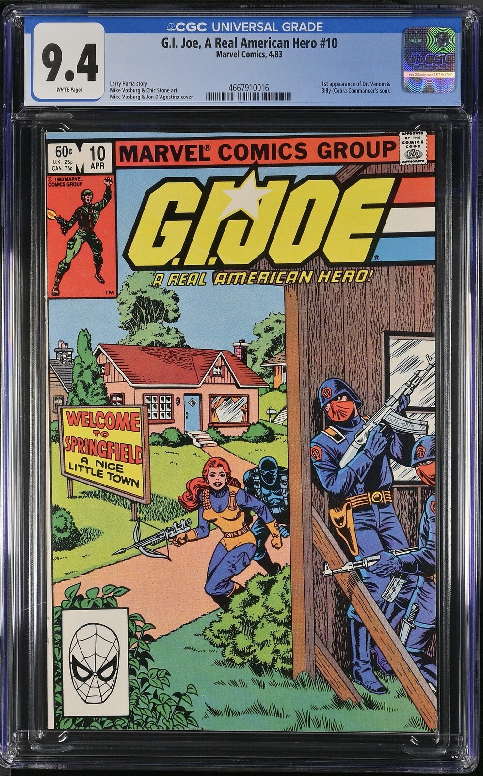 G.I. Joe, A Real American Hero #10 from 4/83 offers a glimpse into the era's iconic storytelling. Featuring 1st appearance of dr. venom &, billy (cobra commander's son)., this issue is a must-have for collectors. Add this CGC 9.4 graded comic to your collection today!Attribute DetailsCertNumber 4667910016DisplayGrade 9.4GradeCategory ModernPageQuality WHITEArtComments Larry Hama story, Mike Vosburg & Chic Stone art, Mike Vosburg & Jon D'Agostino coverKeyComments 1st appearance of Dr. Venom &, Billy (Cobra Commander's son).CollectibleID 11977CollectibleType CTitle G.I. Joe, A Real American HeroIssue 10IssueDate 4/83Publisher Marvel ComicsYear 1983PopulationAtGrade 35population_4_5 1population_5_5 2population_6_0 3population_6_5 1population_7_0 3population_7_5 6population_8_0 5population_8_5 6population_9_0 13population_9_2 13population_9_4 35population_9_6 79population_9_8 64GraderNotes very light crease left top of back coverSeller Information