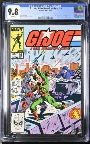Grade: 9.8 Near Mint/MintGI Joe A Real American Hero #16 CGC 9.8.You will receive exactly what is pictured in the listing. Items will be shipped extremely carefully to insure they arrive in excellent condition.All S/H for this auction varies. I do combine items for shipping. Insurance is included with all shipping. For International buyers please note any custom fees charged by your country are your responsibility. I will always try to accommodate any special requests.If there are ever any problems regarding your purchase please contact me prior to putting in claims, leaving negative feedback, or giving out low ratings. I aim for 5 out of 5 stars all the time and will always do my best to fix any issues. I always make sure my customers are happy!!!!I ship fast and secure, just check my feedback. Please feel free to E-mail me with any questions or if you need larger scans. Please check out my other auctions!! Happy Bidding. Good Luck.