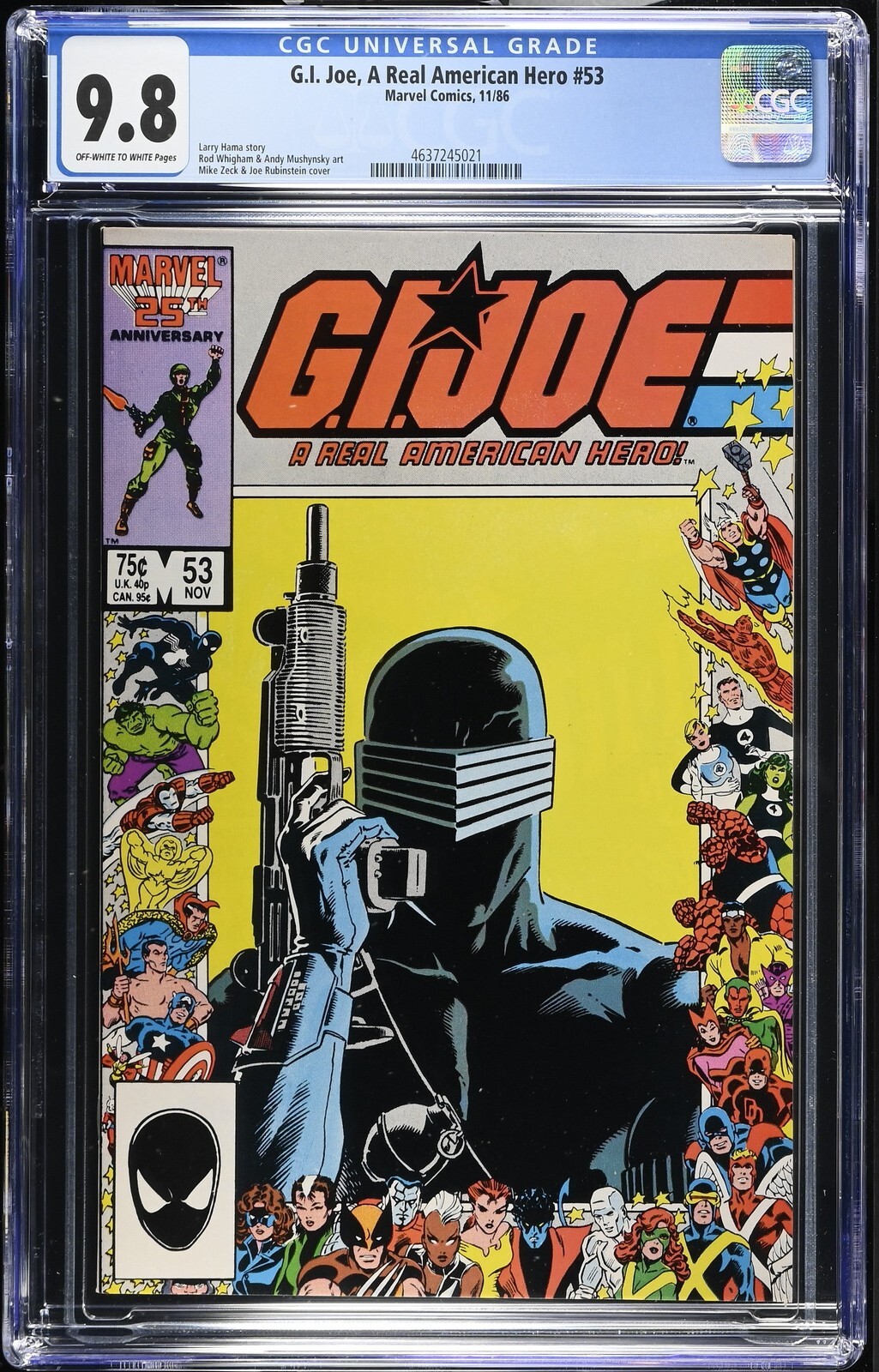 G.I. Joe, A Real American Hero #53 from 11/86 offers a glimpse into the era's iconic storytelling. This issue is a must-have for collectors. Add this CGC 9.8 graded comic to your collection today!Attribute DetailsCertNumber 4637245021DisplayGrade 9.8GradeCategory ModernPageQuality OFF-WHITE TO WHITEArtComments Larry Hama story, Rod Whigham & Andy Mushynsky art, Mike Zeck & Joe Rubinstein coverCollectibleID 15833CollectibleType CTitle G.I. Joe, A Real American HeroIssue 53IssueDate 11/86Publisher Marvel ComicsYear 1986PopulationAtGrade 232population_4_0 2population_5_0 3population_5_5 3population_6_0 3population_6_5 6population_7_0 4population_7_5 17population_8_0 15population_8_5 21population_9_0 22population_9_2 36population_9_4 83population_9_6 137population_9_8 232Seller Information