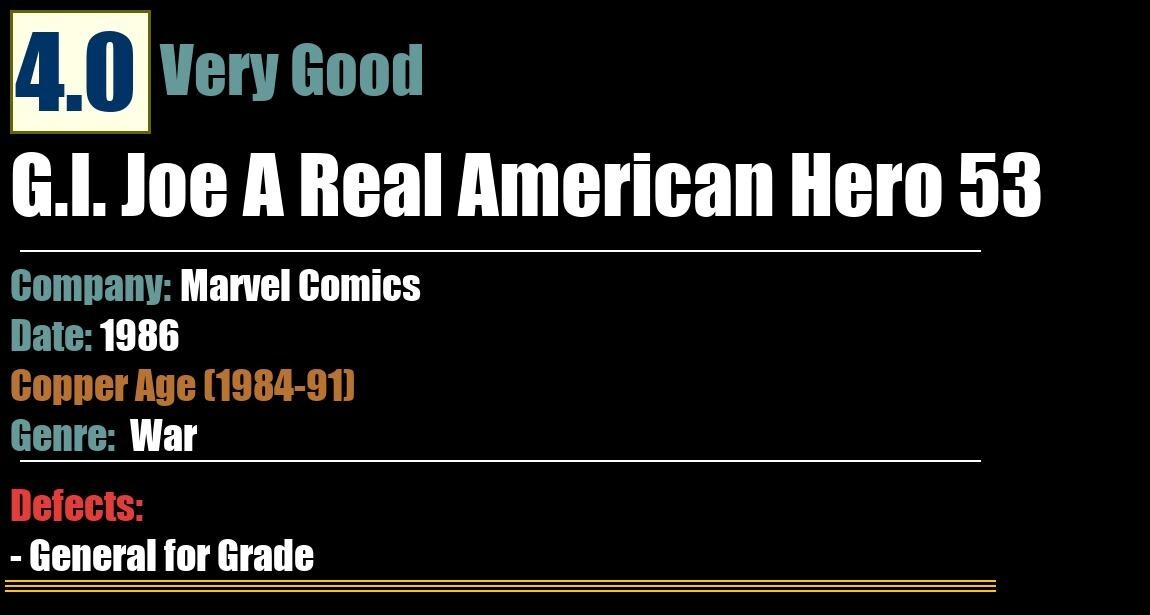 Grade: 4.0 Very GoodShipping may take up to 5 business daysG.I. Joe A Real American Hero 53Marvel Comics - 1986WarCopper Age (1984-91)4.0 Very GoodDefects:- General for Grade: