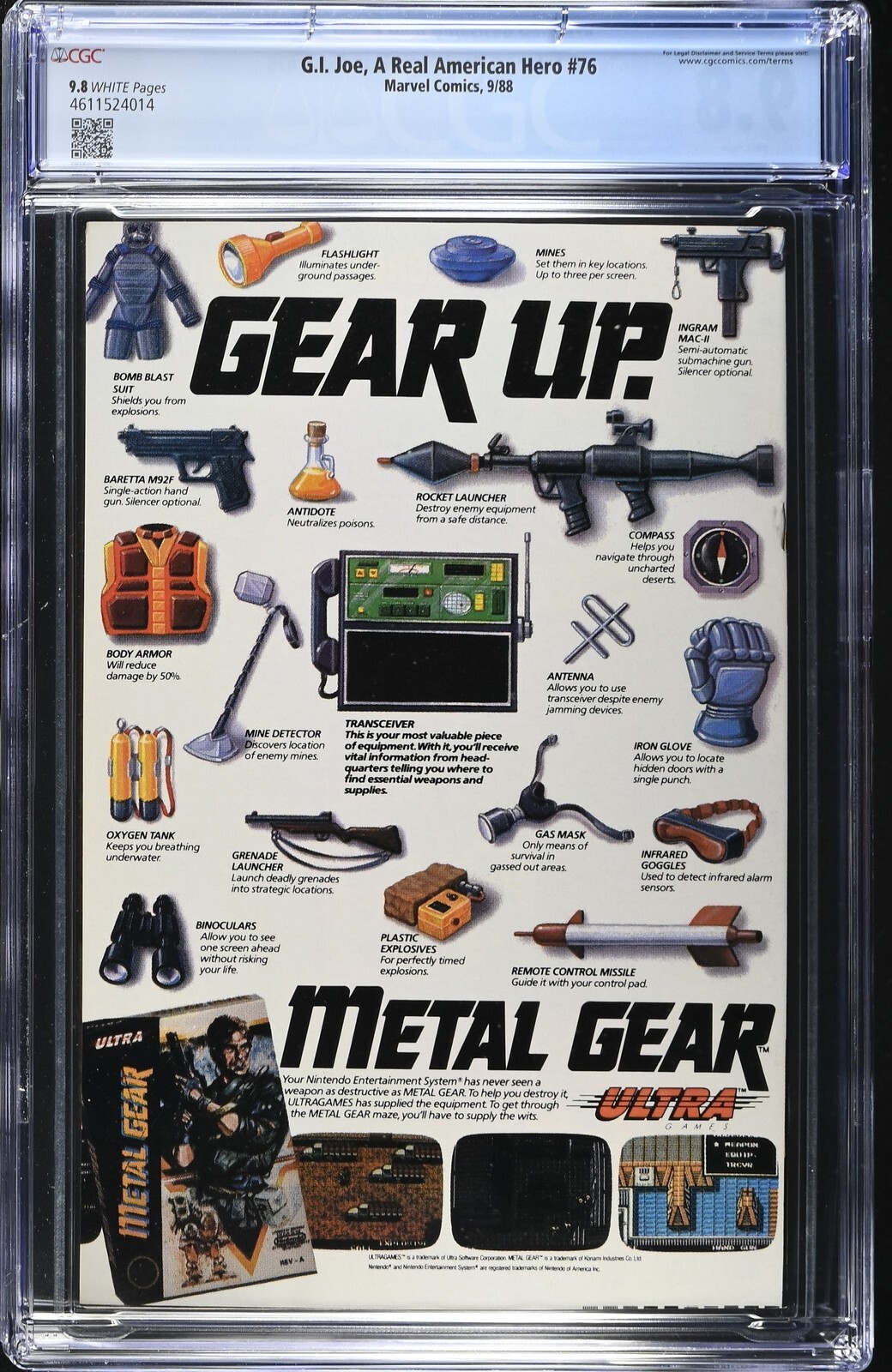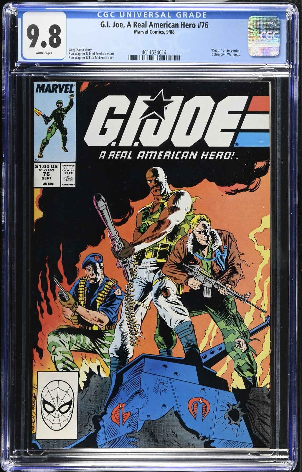 G.I. Joe, A Real American Hero #76 from 9/88 offers a glimpse into the era's iconic storytelling. Featuring "death" of serpentor., cobra civil war ends., this issue is a must-have for collectors. Add this CGC 9.8 graded comic to your collection today!Attribute DetailsCertNumber 4611524014DisplayGrade 9.8GradeCategory ModernPageQuality WHITEArtComments Larry Hama story, Ron Wagner & Fred Fredericks art, Ron Wagner & Bob McLeod coverKeyComments "Death" of Serpentor., Cobra Civil War ends.CollectibleID 30732CollectibleType CTitle G.I. Joe, A Real American HeroIssue 76IssueDate 9/88Publisher Marvel ComicsYear 1988PopulationAtGrade 62population_5_5 1population_6_5 1population_7_0 2population_8_0 2population_8_5 3population_9_0 4population_9_2 2population_9_4 6population_9_6 21population_9_8 62Seller Information