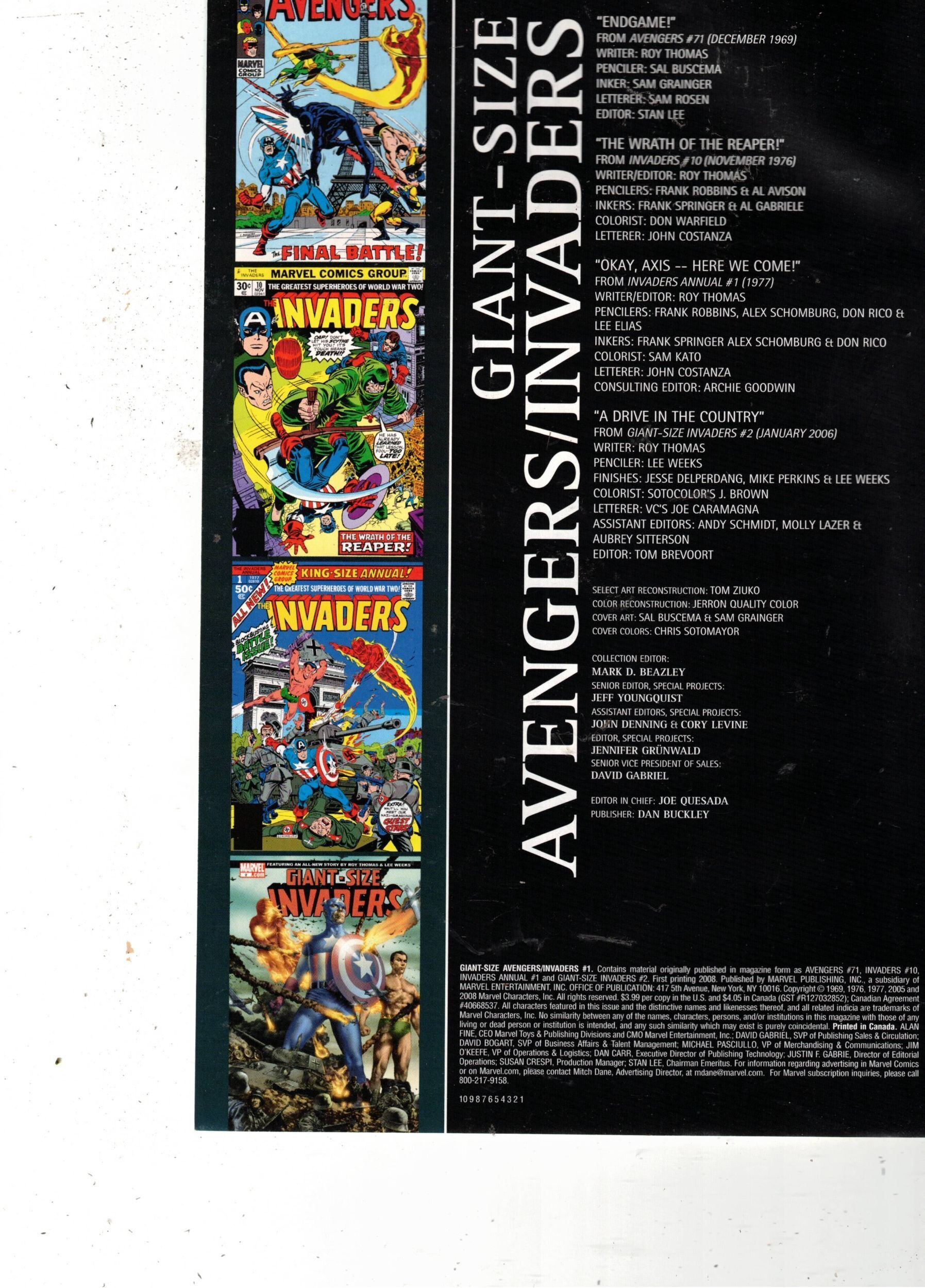 Reprints "Endgame!" from Avengers #71, "The Wrath of the Reaper!" from Invaders #10, "Okay, Axis -- Here We Come!" from Invaders Annual #1, and "A Drive in the Country" from Giant-Size Invaders #2