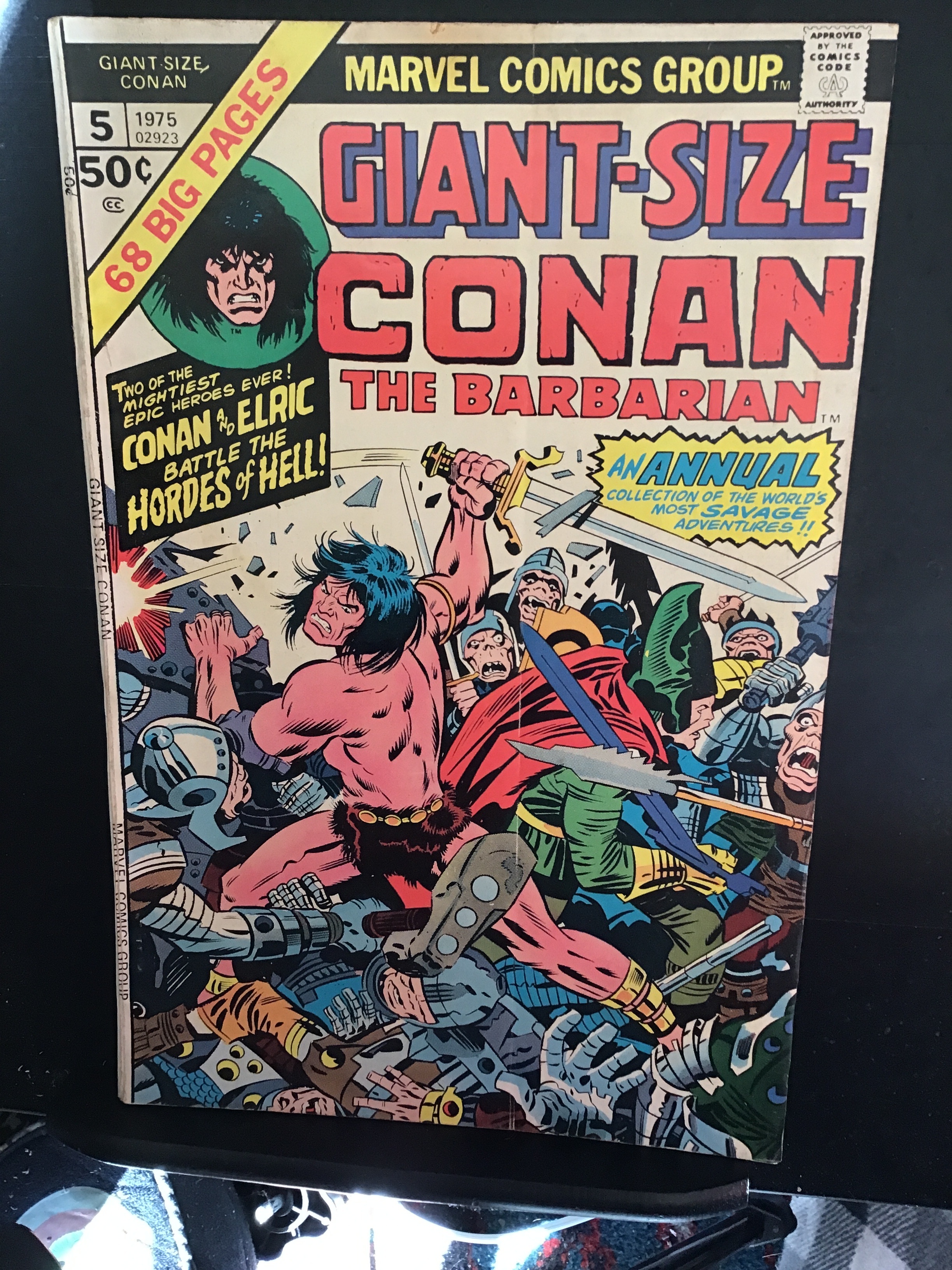 Giant-Size Conan #5 (1975) This book has deep rich color and nice eye-appeal on this all Conan cover. With cream/heavy cream tint pages and white inside covers. The book is well attached at the spine and the centerfold. With A squeeze on the spine area, a thin crease line down the middle of the front cover and light wear appropriate to grade.. We have adjusted the grade accordingly for the page quality etc.Seller Information