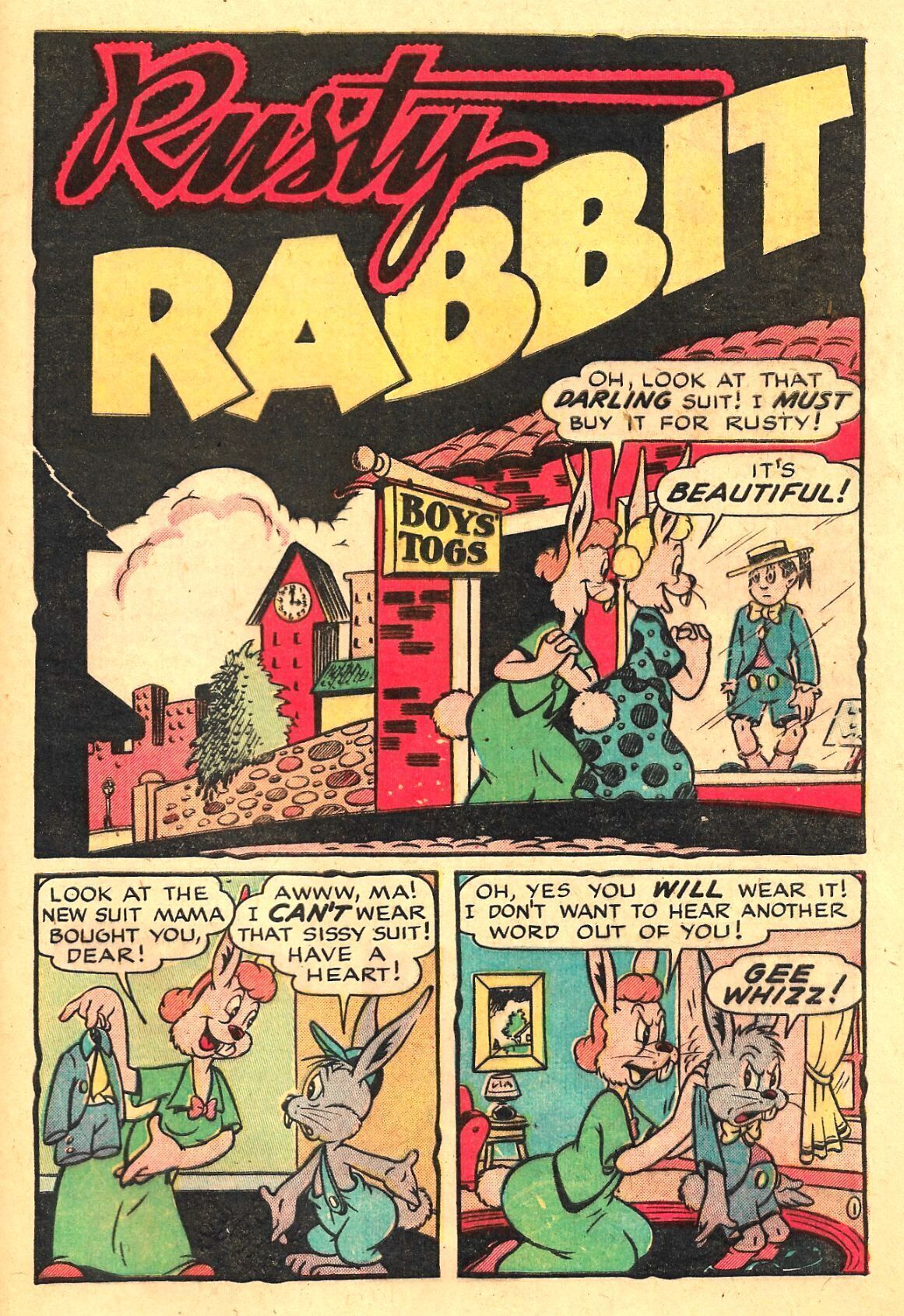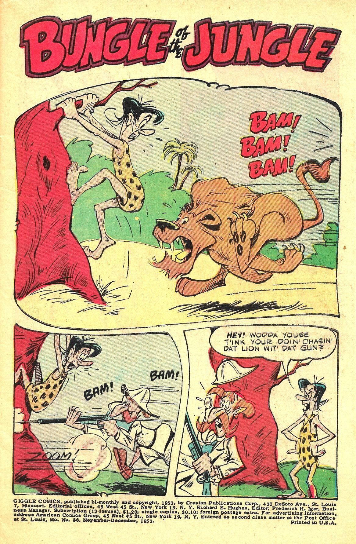 GIGGLE COMICS sold nearly 1 million issues every month in the 1940s to kids who couldn't get enough Funny Animal wackiness to satisfy their oddball cravings! The GIGGLE stable of characters like Bungle of the Jungle, The Duke and The Dope, Rusty Rabbit, Spencer Spook, and others, delivered the laughs!Artists plying their trade at night after working in animation all day include Dan Gordon , Ken Hultgren, Ken Champin, and Bob Wickersham. This issue contains primarily Ken Hultgren art and story (nearly every story in GIGGLE, over the years, was both written and drawn by the same creative hands), with Don Arr Christensen contributing 'The Whiz Horse'!