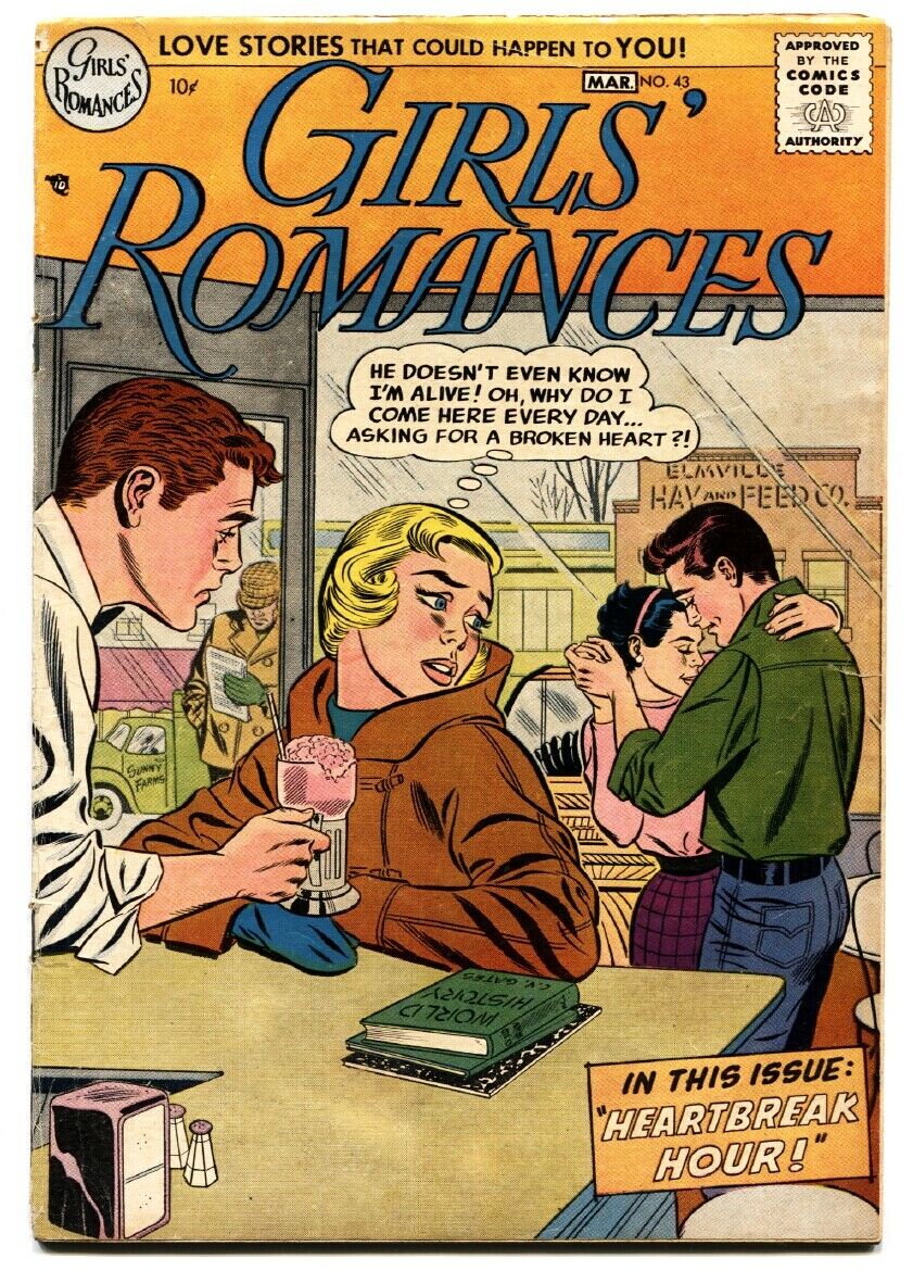 Girls' Romances Issue: 43 / Year: 1957 Condition: VGDC Romance. Soda shop cover, ice cream. Publisher: N/ASku: CK35-091 Over 100,000 mail orders processed! Buy with confidence.
