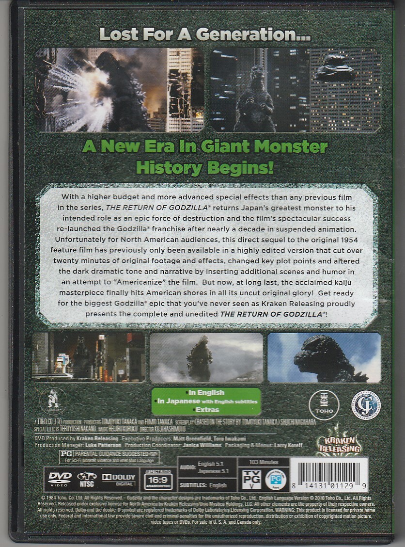 The Japanese version of what would become Godzilla 1985, heralded as a direct sequel to the original Godzilla bringing back Perry Mason's Raymond Burr as Reporter Stephen Lang. However, the original Japanese version naturally comes without the American footage