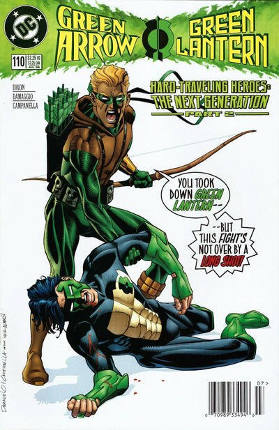 Item: Green Arrow #110 (Newsstand) | Publisher: DC | Cover Date: July 1996 | Writer: Chuck Dixon | Artist: Rodolfo Damaggio | Cover Artist: Rodolfo Damaggio | Appearances: Green Arrow (Connor Hawke), Green Arrow (Oliver Queen), Green Lantern (Kyle Rayner), Lois Lane | Storylines: Hard-Traveling Heroes: The Next Generation, Part 2; Desolation Again | Notes: Cover homage to Green Lantern #87 (2nd series); newsstand edition | With Economy shipping, each additional comic ships for just 50 cents more to customers in the USA. This listing contains a stock photo and information from ComicBase™ and © Human Computing. The stock photo is for reference only. If you would like to see a photo of the actual item, please message us prior to purchasing.Seller Information