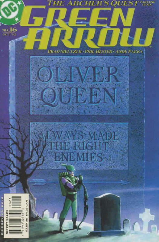 VF/NM Item: Green Arrow (2nd Series) #16 Publisher: DC Cover Date: October 2002 Cover Artist: Matt Wagner Writer: Brad Meltzer Artist: Phil Hester Appearances: Superman, Oracle, Shade, Catman, Arsenal Storyli ... Read More