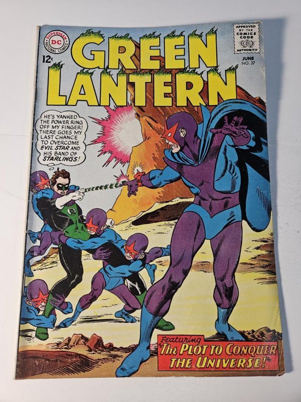 Green Lantern #37 features the story "The Plot to Conquer the Universe," where Green Lantern faces off against Evil Star and his band of Starlings. This issue is a classic battle showcasing the Lantern's powers and resilience. The cover art is vibrant, highlighting the confrontation. There are noticeable signs of wear, particularly along the spine and edges.