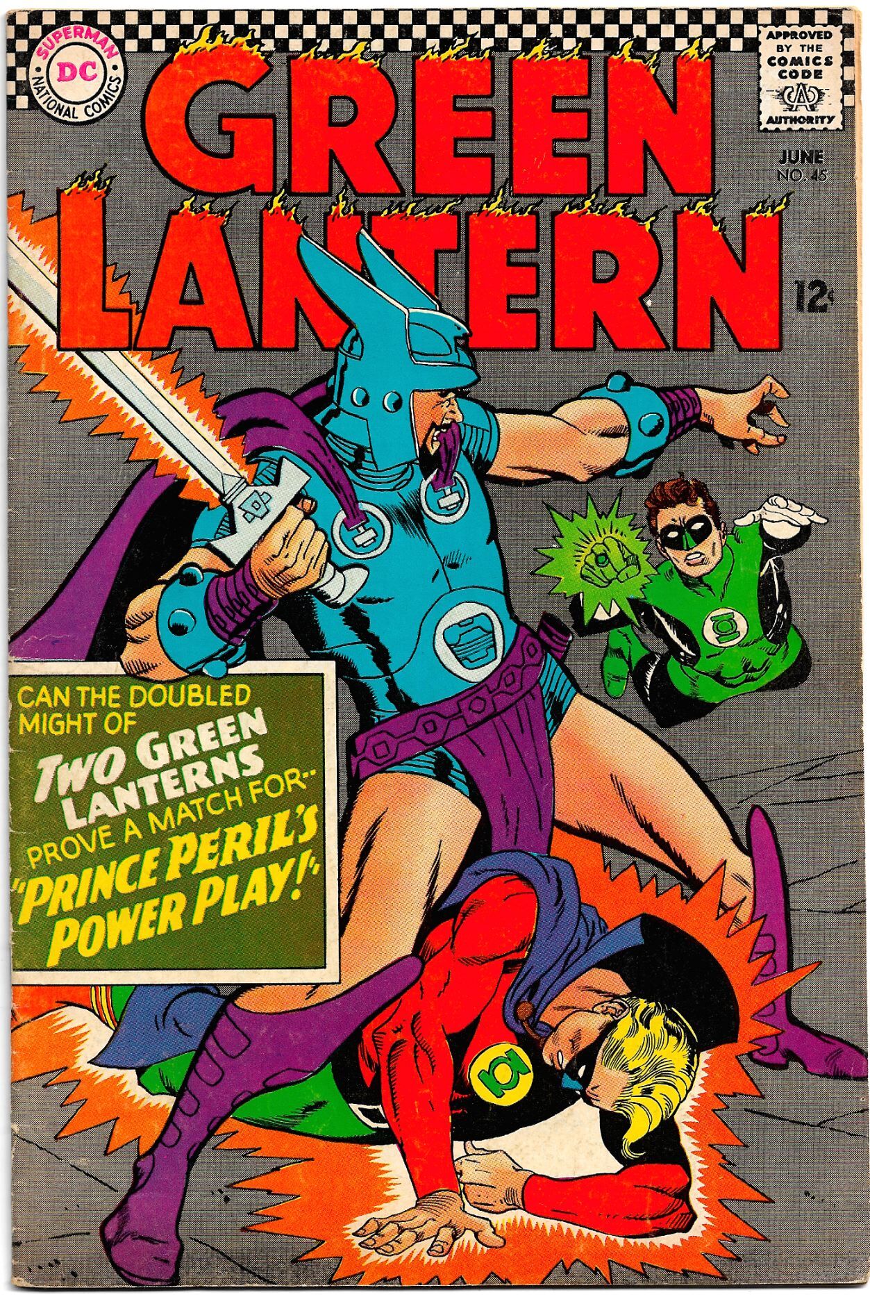 The Original Golden Age GREEN LANTERN, Allan Scott, makes an appearance here alongside the Silver Age GL, Hal Jordan, in a John Broome story beautifully and dynamically illustrated by the incredible Gil Kane and inked with the gorgeously precise lines of Sid Greene!In "Prince Peril's Power Play" , a Princess from a distant planet travels to Earth to find a perfect husband so that she doesn't have to marry the aggressive Prince Peril of her own kingdom. She first meets Doiby Dickles - Allan Scott's 'sidekick' - and he takes her to Allan. But Prince Peril soon finds them and defeats Allan Scott in a battle over the Princess. Doiby is able to help the Princess escape and jump dimensions to Earth One, where they enlist the aid of Hal Jordan.