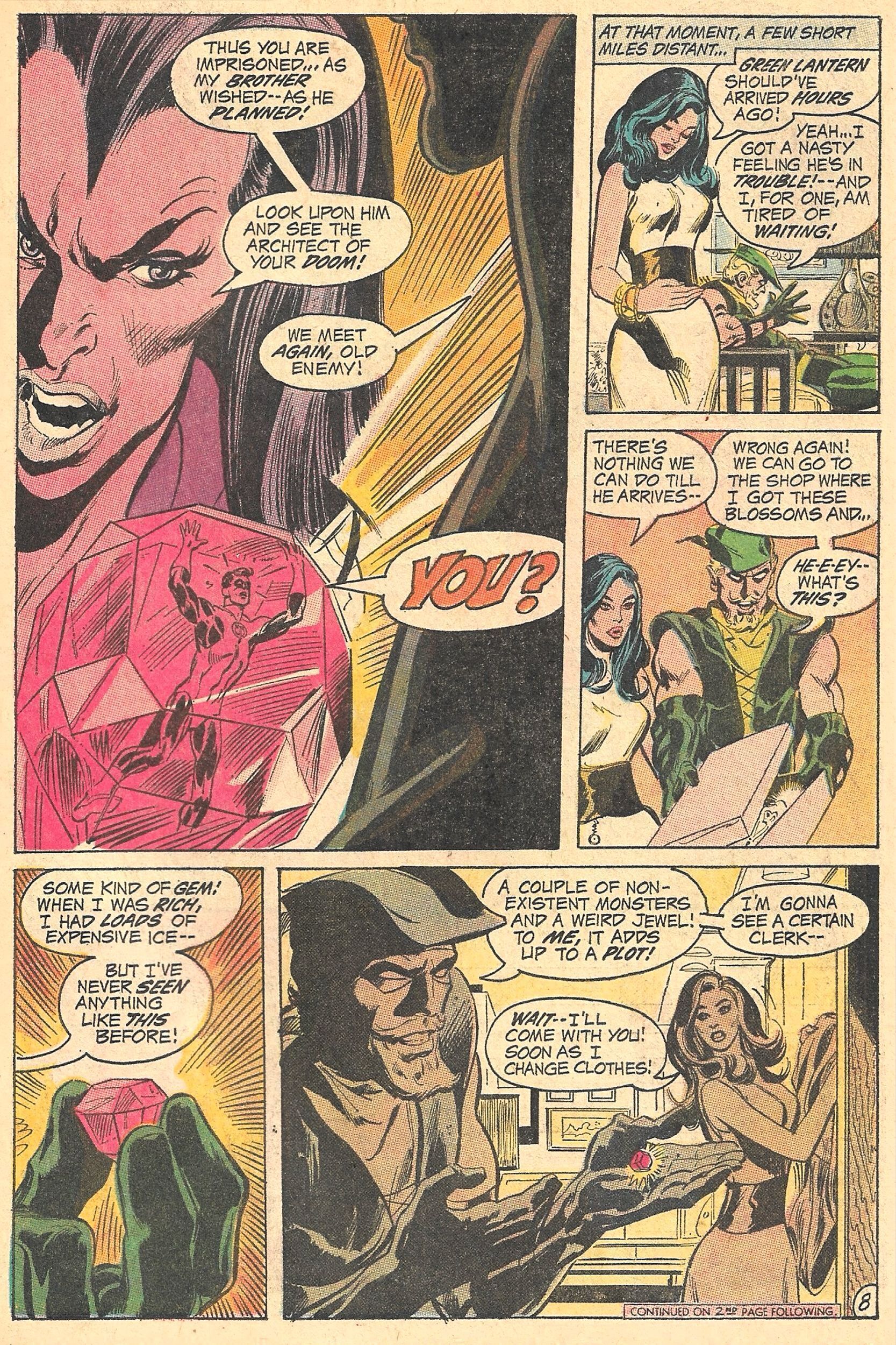 Just 6 issues since the groundbreaking GREEN LANTERN #76 opened comic book readers eyes to the huge gray area in real life that had nearly always been previously portrayed as simply black and white or good vs. evil conflicts, Writer Denny O'Neil turns his focus here away from societal ills to craft a more customary good 'ol monster/terror/wizardry/nightmare yarn!.In GREEN LANTERN/GREEN ARROW #82, with illustrations by the incomparable Neal Adams, you get "How Do You Fight a Nightmare?". When GREEN ARROW and BLACK CANARY are confronted by HARPIES, GA calls GREEN LANTERN for help. GL follows the HARPIES into a trap laid by THE WITCH QUEEN on behalf of her brother SINESTRO.