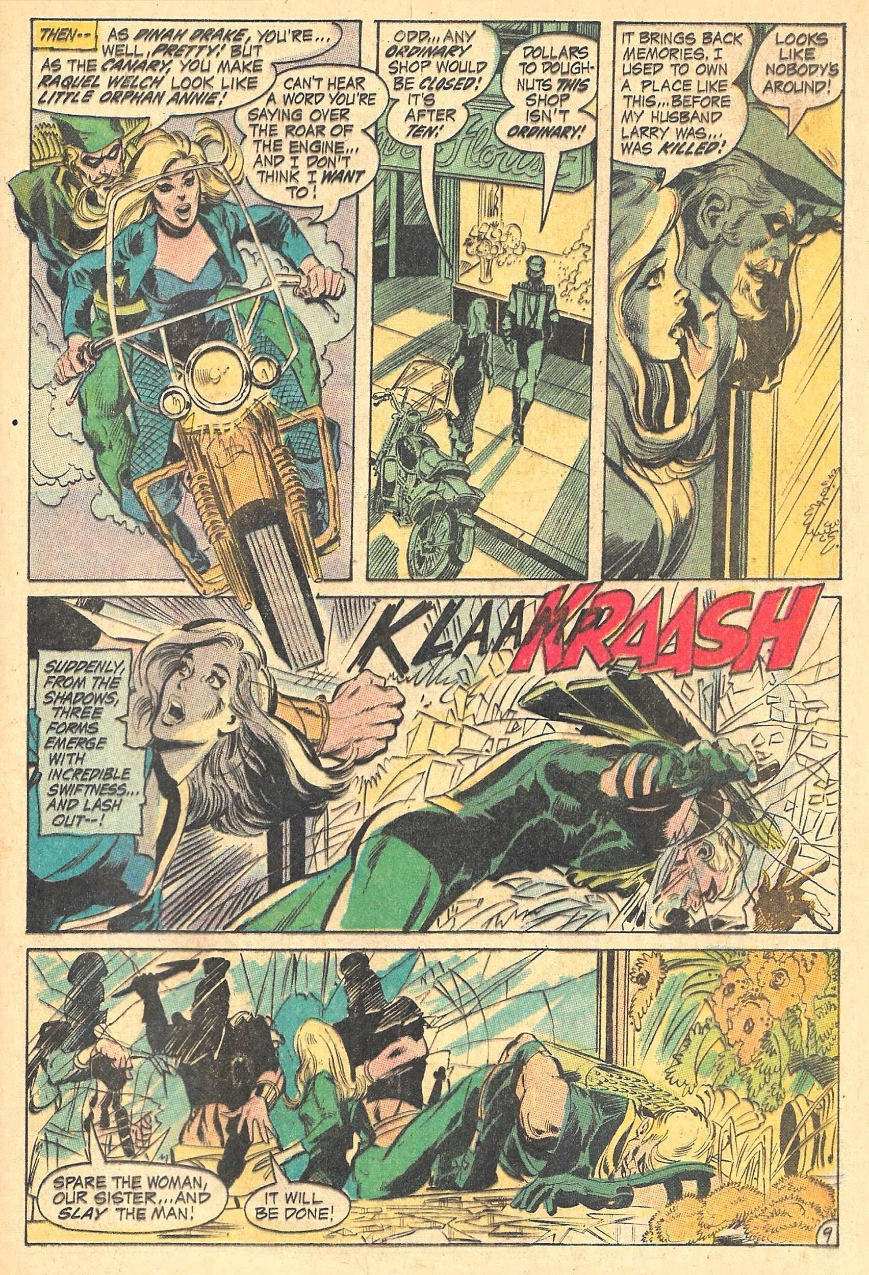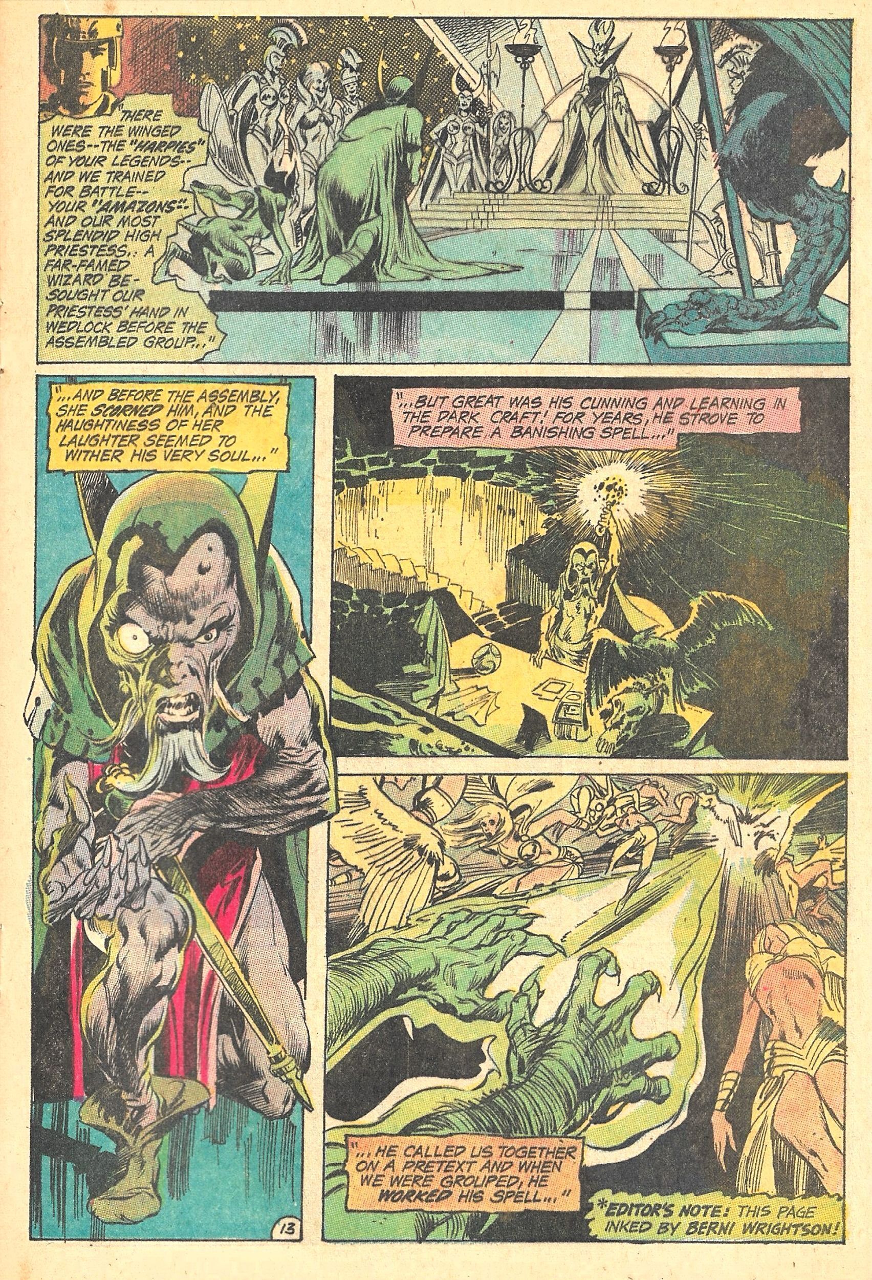 Following a lead, GA and BC meet a group of Amazons, who, impressed by BLACK CANARY's fighting skills, explain how in the distant past they were banished to another plane by a wizard, but have been allowed to return by THE WITCH QUEEN to make all men pay.
