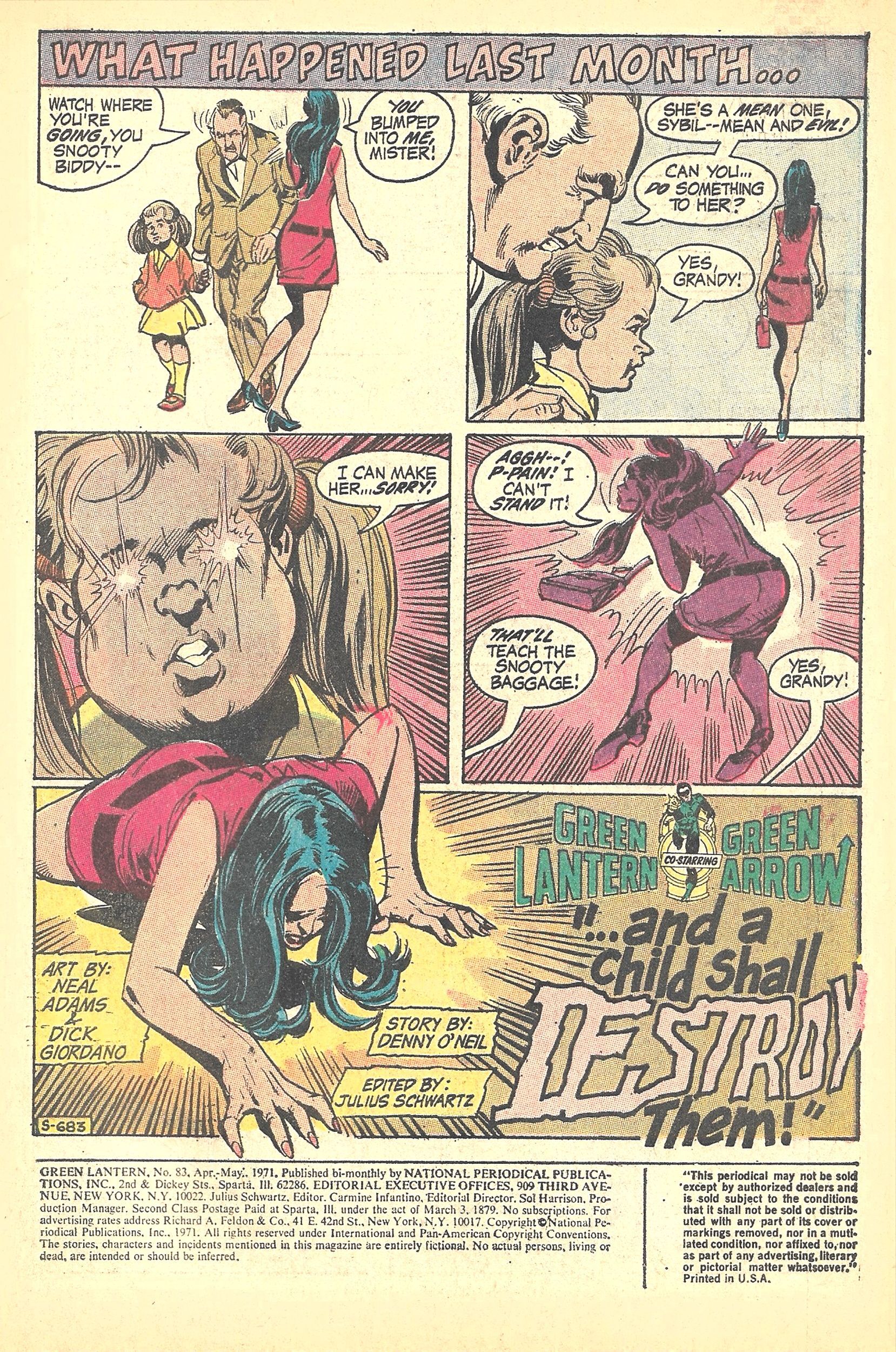 Just 7 issues since the groundbreaking GREEN LANTERN #76 opened comic book readers eyes to the huge gray area in real life that had nearly always been previously portrayed as simply black and white or good vs. evil conflicts, writer Denny O'Neil turns his focus here away from societal ills to craft a more customary good 'ol monster/terror/nightmare yarn!.In GREEN LANTERN/GREEN ARROW #83, with illustrations by the incomparable Neal Adams, and inked by Dick Giordano, you get ". . . and a Child Shall Destroy Them!", a creepy tale of a young girl in possession of psychic powers.