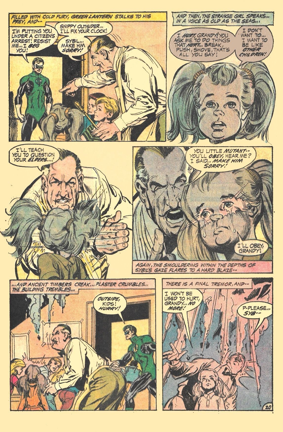 After the costumed heroes are asked to leave, DINAH learns that in Sybil, Grandy (the true villain of the story) has finally found a way to keep the children of the school in order. GREEN LANTERN and GREEN ARROW return to the school just in time to save DINAH, and when Grandy orders Sybil to attack GL, she refuses and brings down the roof on herself and Grandy!