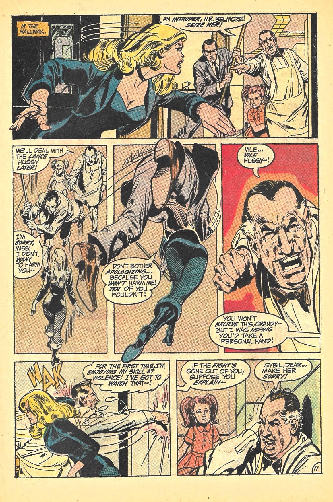 GREEN LANTERN and GREEN ARROW accompany DINAH LANCE (BLACK CANARY) as she begins a job at a private school. There they are greeted by the owner, Jason Billmore, the cook, Grandy (who is caricatured throughout by Neal Adams as SPIRO AGNEW, the disgraced vice-president of the U.S. at the time!) (that's him on the cover!) and a little girl named Sybil (who is also slyly caricatured, as RICHARD NIXON!!).