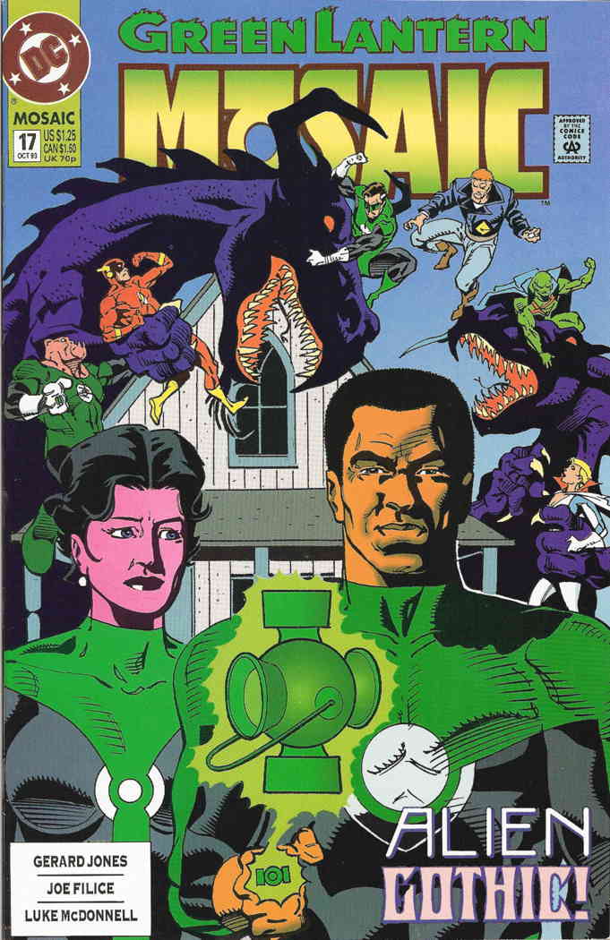 Item: Green Lantern: Mosaic #17 | Publisher: DC | Cover Date: October 1993 | Writer: Gerard Jones, Joe Filice | Artist: Luke McDonnell | Appearances: Green Lantern (Hal Jordan), Green Lantern (Guy Gardner), Green Lantern (Kilowag), Martian Manhunter, Flash (Wally West), Power Girl | Storylines: Get Used to It | With Economy shipping, each additional comic ships for just 50 cents more to customers in the USA. This listing contains a stock photo and information from ComicBase™ and © Human Computing. The stock photo is for reference only. If you would like to see a photo of the actual item, please message us prior to purchasing.Seller Information