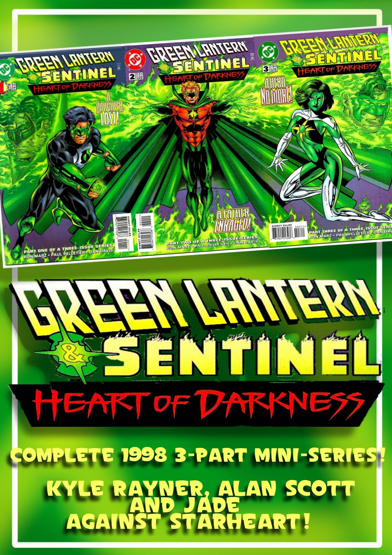 This imaginative mini-series, written by Ron Marz and illustrated by Paul Pelletier, appeared near the end of volume 3 of the GREEN LANTERN title, when Kyle Rayner, a young art student, was introduced as the new protagonist and the "last" Green Lantern, since the Corps no longer existed. He fell in love with the original Golden Age GREEN LANTERN's daughter, JADE, who also wielded the ring's power.This 3-parter takes place after JADE has disappeared, and Rayner and Alan Scott go on a search for her, first interrogating the supervillain BRAIN WAVE at Arkham Asylum, who they suspect somehow arranged for her to be kidnapped. But while there, they are confronted by JADE's brother, OBSIDIAN, and battle him to prevent him from killing BRAIN WAVE. But they are able to subdue him long enough to learn that the STARHEART, the personification of the original force behind Alan Scott's ring, has JADE captive!