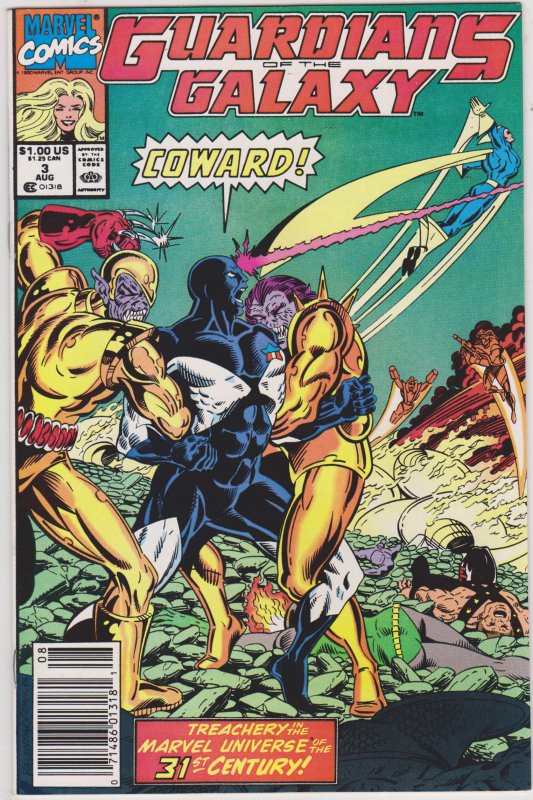 Guardians of the Galaxy #3 by Marvel Comics copyright 1990. I have graded the comic book, using the Overstreet Grading Guide, at FINE+ with the following defects: Couple of light stress marks along the spine. The corners are rounded. There is yellowing of the pages.Seller Information