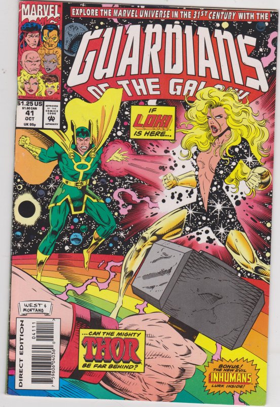 Guardians of the Galaxy #41 by Marvel Comics copyright 1993. I have graded the comic book, using the Overstreet Grading Guide, at FINE with the following defects: Couple of light stress marks along the spine. The corners are rounded. There is light yellowing of the pages.Seller Information