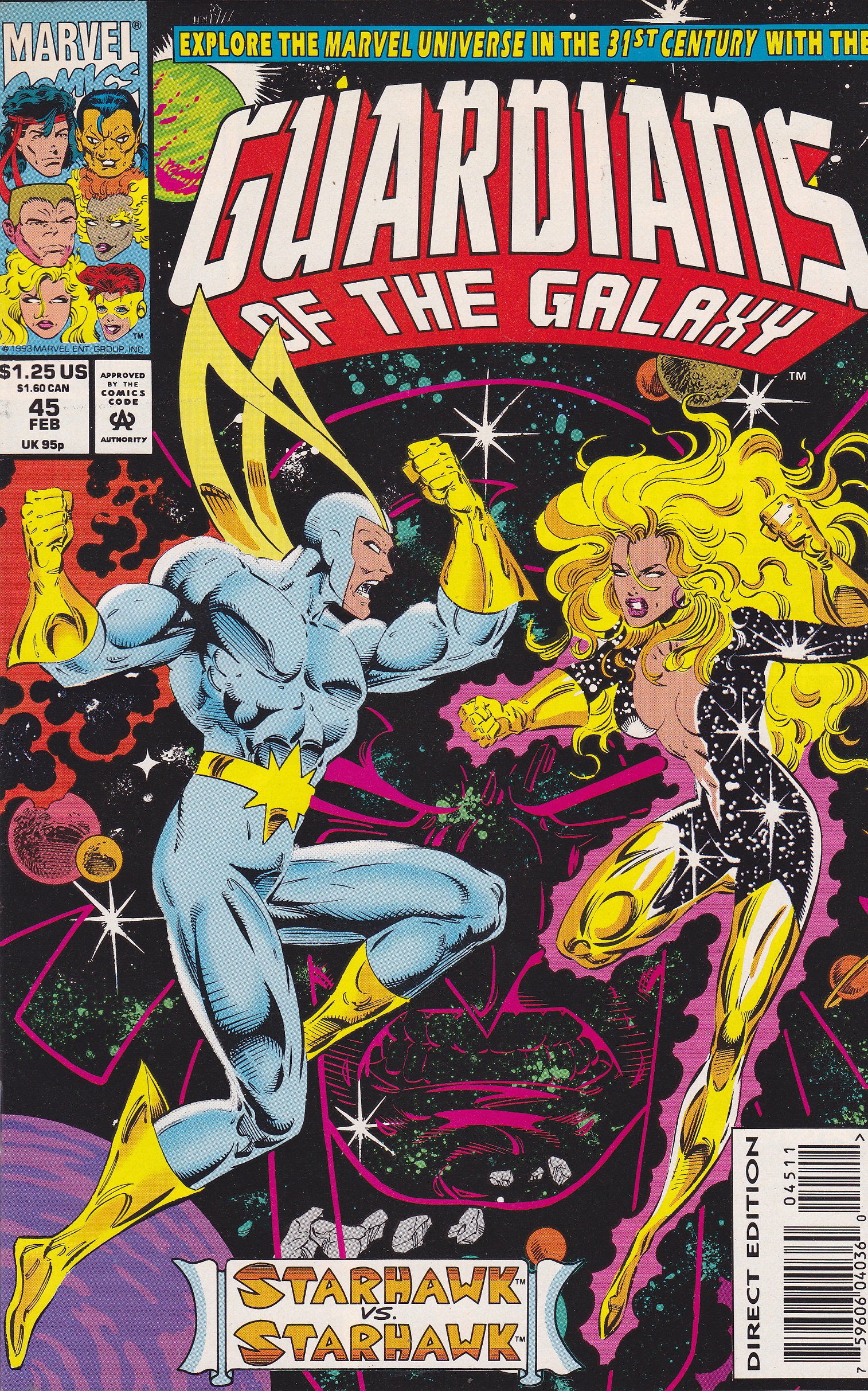 Guardians of the Galaxy #45 by Marvel Comics copyright 1993. I have graded the comic book, using the Overstreet Grading Guide, at VERY FINE with the following defects: Couple of light stress marks along the spine. The corners are rounded. There is light yellowing of the pages.Seller Information