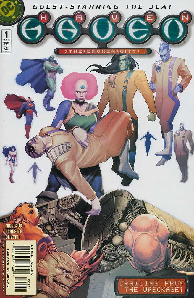Contains Issue #'s 1-9 ***The COMPLETE Series! '"Broken City" begins with battles between JLA, Alliance and prisoners of Haven, who escaped during the crash. President Luthor assigns an Ambassador to the city and arranges for aid to be supplied, while Siv, Katalia, Nia, Valadin, Ivas and Mavaar, amongst others, interact with their new, human neighbors. They also have to discover who sabatoged Haven, before the traitor alerts Anathema, from whom they were fleeing.' - N. F. (Slings & Arrows Comic Guide)