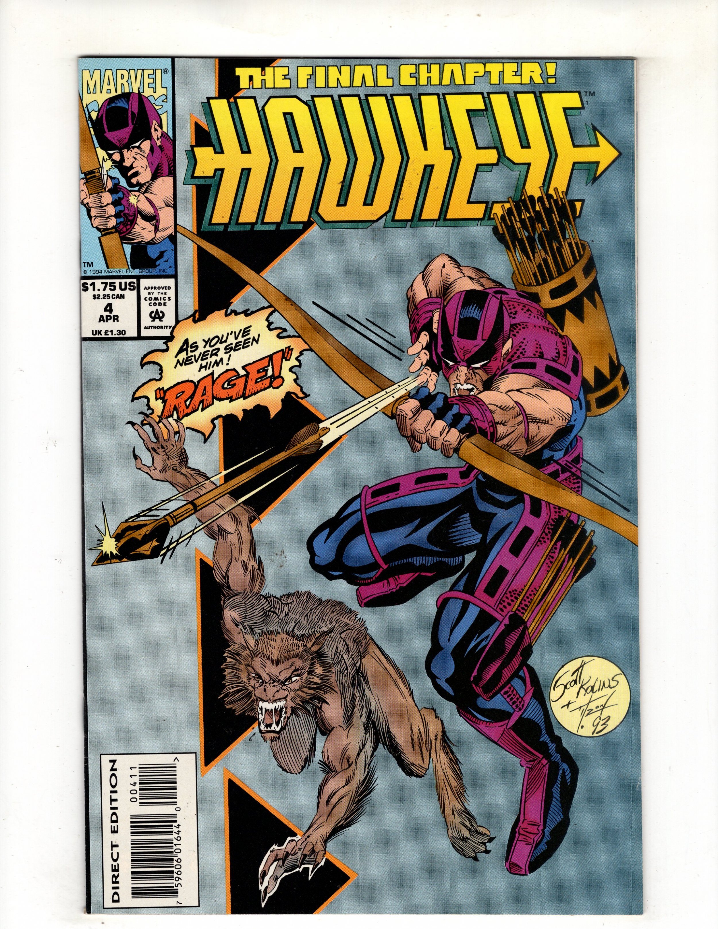 "Rage" Script by Chuck Dixon. Pencils by Scott Kolins. Inks by Tim Dzon. Cover by Scott Kolins and Tim Dzon. The Avengers' ace archer heads to South America for the final battle against the Secret Empire and Viper! With the loyal Rover by his side, the brave bowman fights through the jungle against the empire's savage creations! And after an assist from Trick Shot, Clint gets his one-on-one shot vs. the Viper! Can the Master Marksman make it count? And perhaps come to grips with the loss of Mockingbird at the same time? May Hawkeye's aim be true! Cameo appearance by Javelynn.
