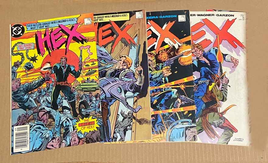 Up for your viewing pleasure and consideration is this 10 issue Hex lot from 1985. It feature both the first and the last issues of the series, as well as most of the series in between. All the issues in this lot are Newsstand variants. The books have some light creasing, but are overall in good condition. I believe most are in the 3.5 - 4.0 VG condition. despite the creasing the books all lay flat and retain original cover color. The interiors display nice white page quality. The Hex series has always been one of my all-time favorite comic book series. It had that special blend of old school western meets Sci-Fi and featured an action packed storyline highlighted with legendary Mark Texeira Cover and Art. If your looking for a great read, these lower grade newsstand issues will most certainly fit the bill..... and at a price that won't break the bank.