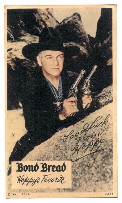 Hopalong Cassidy Bond Bread Giveaway Card Issue: / Year: Condition: FNWilliam Boyd - Hopalong Cassidy. Giveaway card. Size is about 6.5" x 11". Rare. Publisher: N/ASku: CK45-116 Over 100,000 mail orders processed! Buy with confidence.