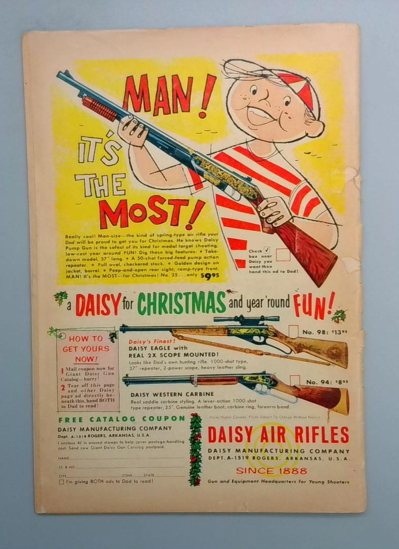 Also included is a vintage Daisy Manufacturing Company advertisement promoting their air rifles and toy guns as Christmas gifts, a common feature in comics of this era that reflects the marketing practices and cultural attitudes of the period.