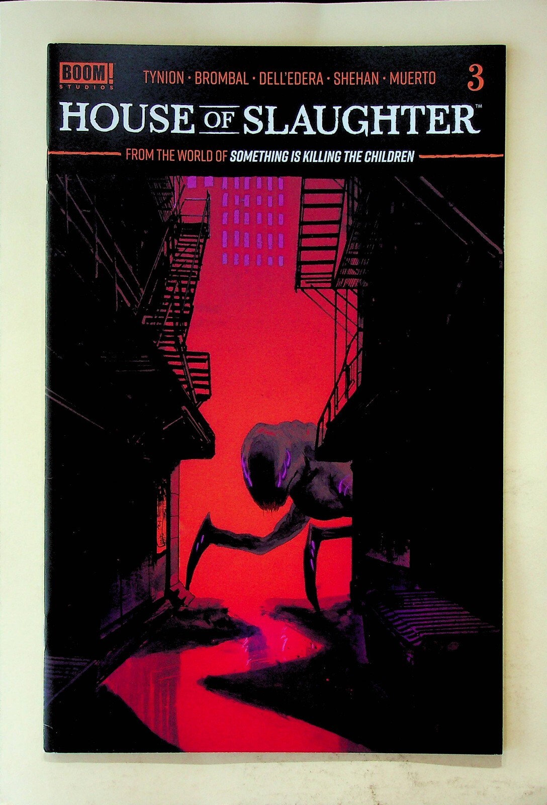 Grade: 9.4 Near MintThis is a comic of House of Slaughter #3 - From the World of Something is Killing the Children published by Boom! Studios in Nov., 2021. The grade is probably at least a Near Mint but I will leave that up to the buyer to determine from the scans.The pictures are of the actual copy being auctioned. The pages are complete and intact. It has been stored bagged and boarded in a climate controlled environment in a smoke free home.If you would like more information, please feel free to ask. Please check out our other listings for more interesting items. I combine shipping whenever possible. All items are well packed and sent by USPS Ground Advantage Mail.