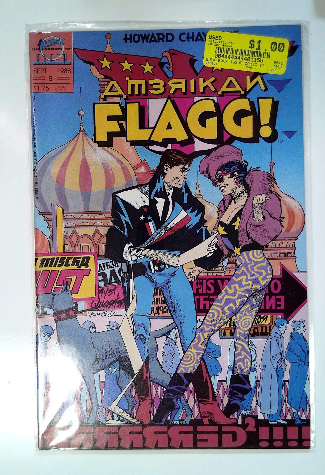 Grade: 8.5 Very Fine+Cosmic-King HomeView All ListingsSee FeedbackAdd to Favorite SellersLeave FeedbackDESCRIPTIONHoward Chaykin's American Flagg #5 First Comics 1988 8.5 VF+ Very Fine+ Condition Copper Age Comic Book 2nd Series 1st PrintingHoward Chaykin's American Flagg #5 (1988) While running some errands, Reuben ends up in the middle of a gun battle on a TV talk show and then the chief ranger inducts him into the Soviet Rangers in "Red Highlights and Permanent Waves." Script by Howard Chaykin & John Moore and art by Mike Vosburg & Richard Ory. Issue also has an "American Flagg Dossier" update.Increase your comic book collection and enjoy reading this comic book featuring First Comics American Flagg.Our newer comic books for sale are usually* high grade, unread, mostly flat, and glossy dealer back stock. Expect a deterioration in condition for older comics.*See the listing image(s) to get a better evaluation of the condition. Gradings, if provided, are of our personal opinion. You should NOT buy solely based on the grade.PAYMENT DETAILSPay with Google Pay, PayPal, PayPal Credit, debit card, or most credit cards.SHIPPING DETAILSOrders ships out the same day or next business day. The average shipping delivery time range from 2 to 9 days. Using Economy Shipping options which is usually USPS Ground Advantage.SHIPPING PROMOTIONS - Combined Shipping - Cart Items Reduced ShippingPay shipping once with our ongoing comic book flat rate promotion*. You won't pay additional shipping for multi-comic orders bought together in the cart.*Exclusions apply - CGC/Slabbed won't qualify.RETURNS30 days money back guaranteed. Returns accepted and shipping will be paid by the seller.Check Out Our Other ListingsComicsHip Store:Cosmic-King©2024 cosmic-king. All Rights Reserved.