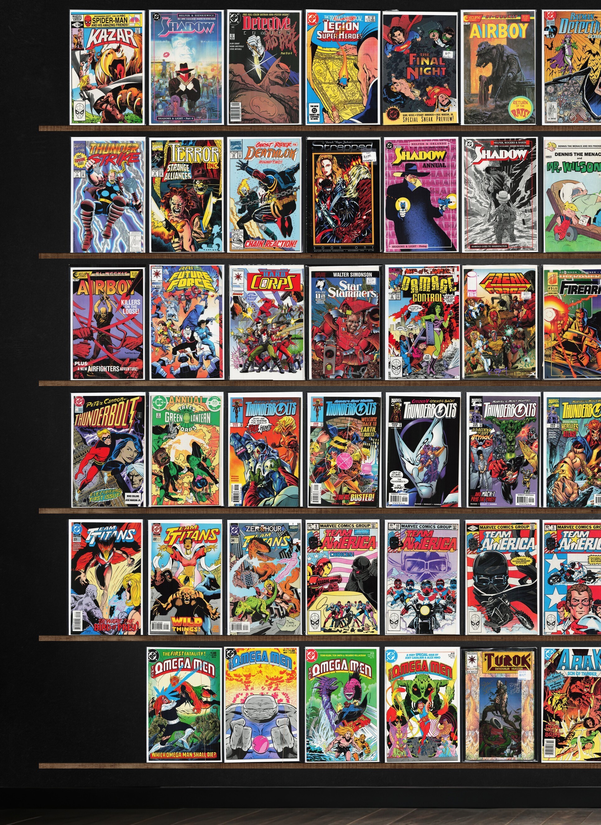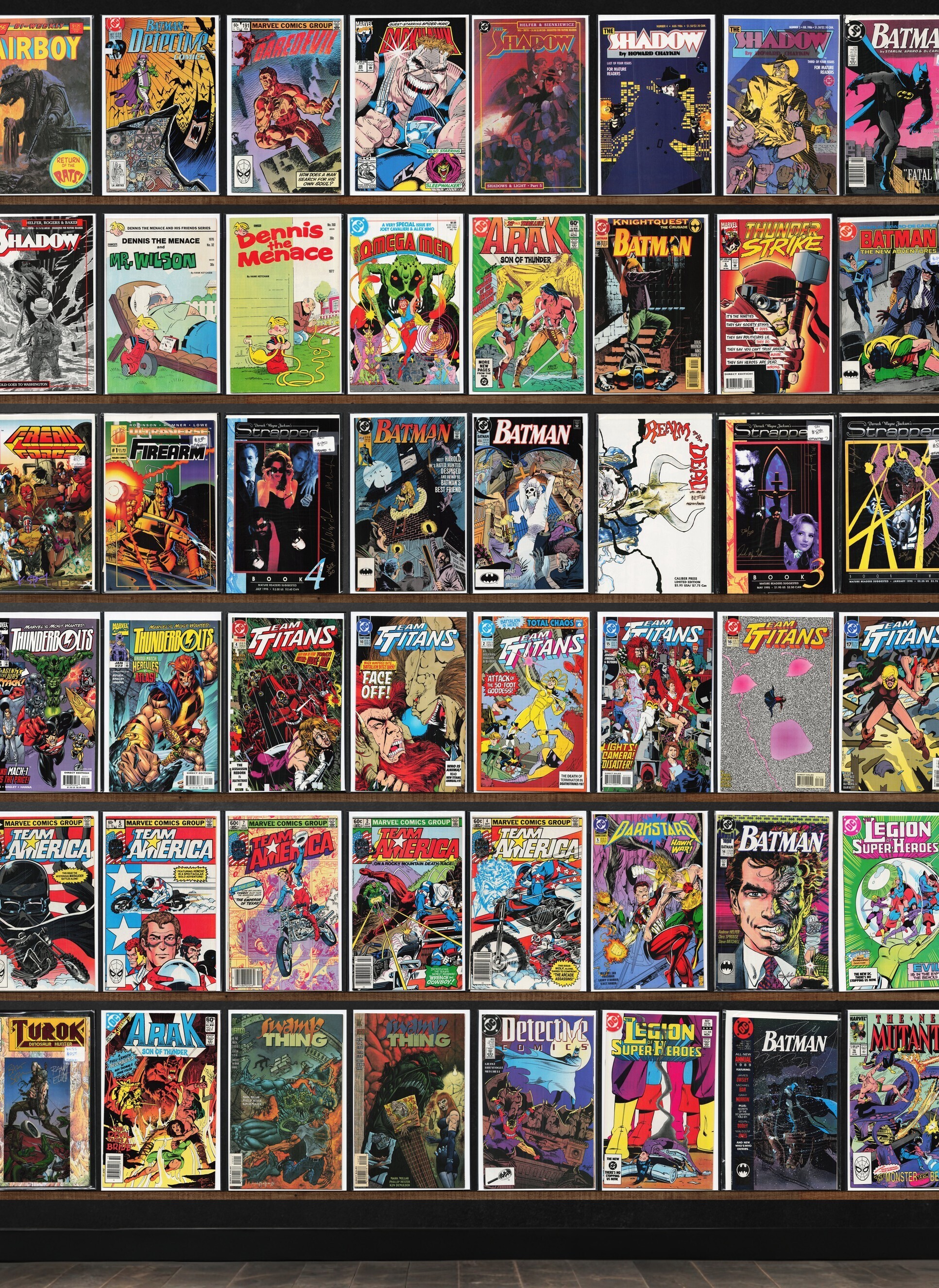 Team Titans, The Omega Men, Team America, Batman, The Shadow, Thunderbolts, Legion Of Super Heroes, Detective Comics, Airboy, Daredevil, Thunderstrike, Terror Inc., Strapped (1994), The H.A.R.D. Corps, Strapped (1995), Batman Annual, The Flash, Swamp Thing, The New Mutants, Ka Zar The Savage, The Final Night, Darkhawk, Detective Comics Annual, The Mighty Thor, Deathlok, The Shadow Annual, Dennis The Menace, Rai, Star Slammers, Damage Control, Freak Force, Firearm, Team Titans Annual, Darkstars, The Maxx: Maxximized, Turok, Dinosaur Hunter, Darkman, The Spectacular Spider-Man
