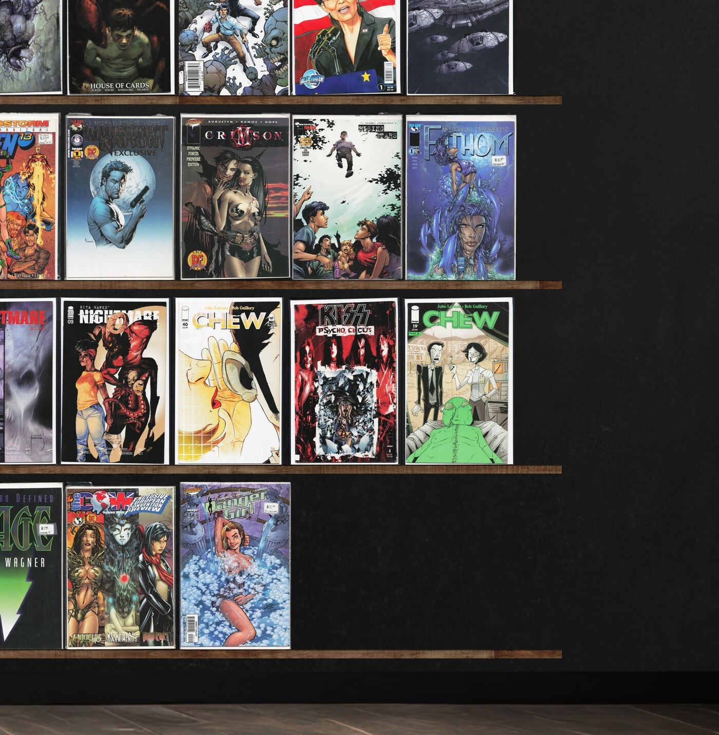 Angel, The Walking Dead, Angel + Spike, Magnus Robot Fighter, Civil War, The H.A.R.D. Corps, Wild Thing, Realm, Silver Surfer, Cyberspace 3000, Gen13, Rising Stars, Death'S Head Ii, Chew, Phoenix, Exotica Lust (1992 ... Read More