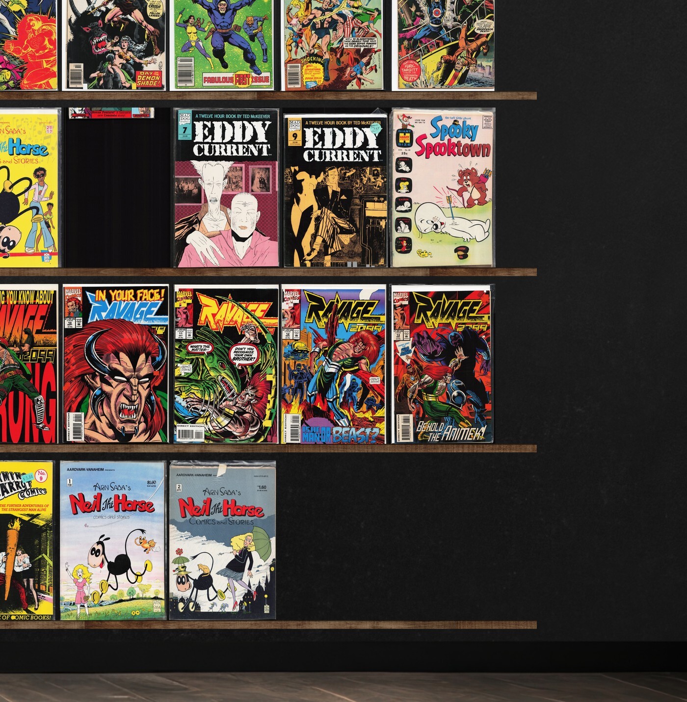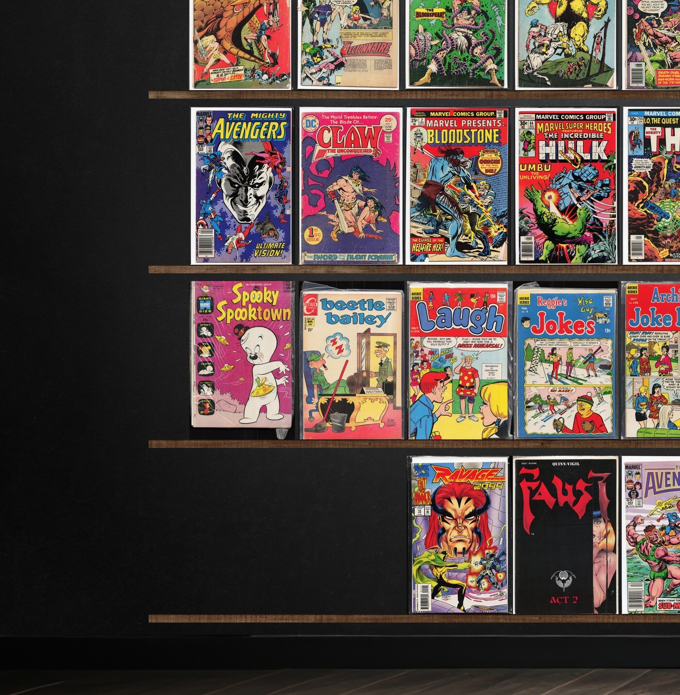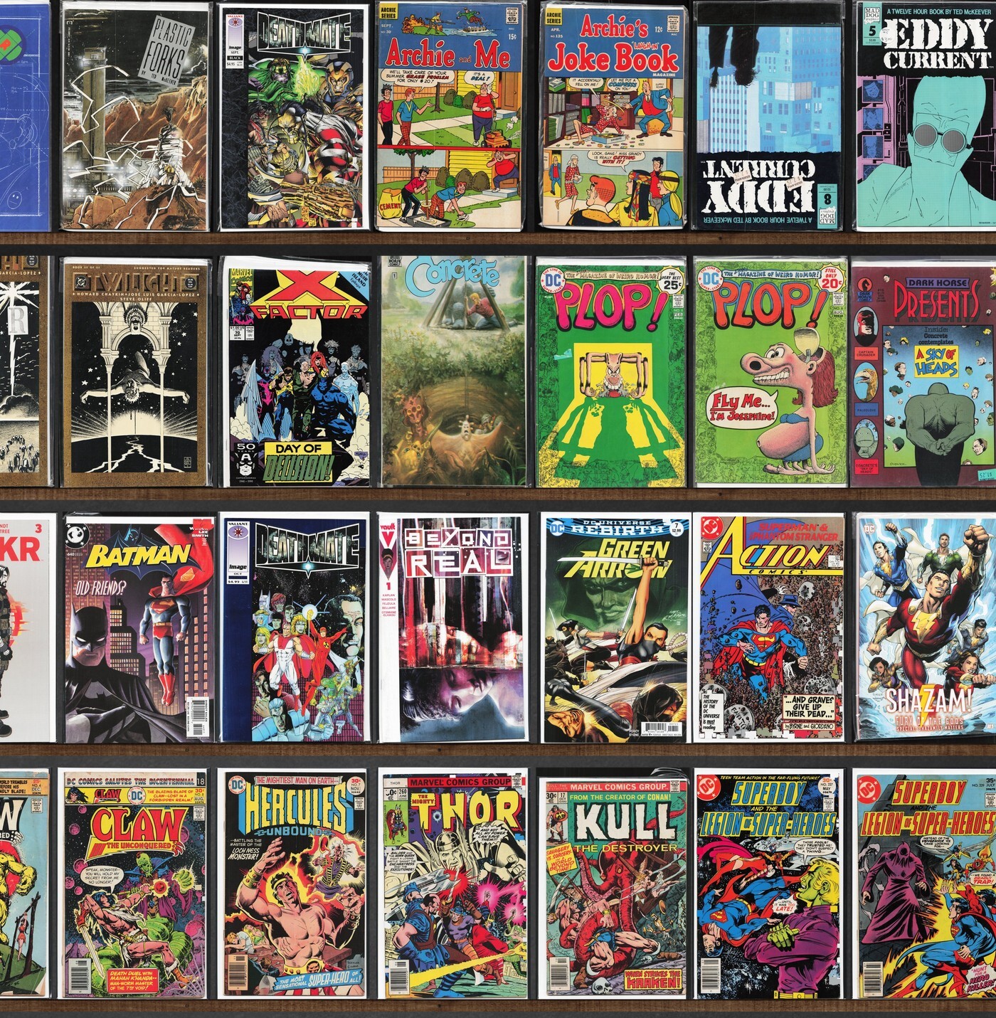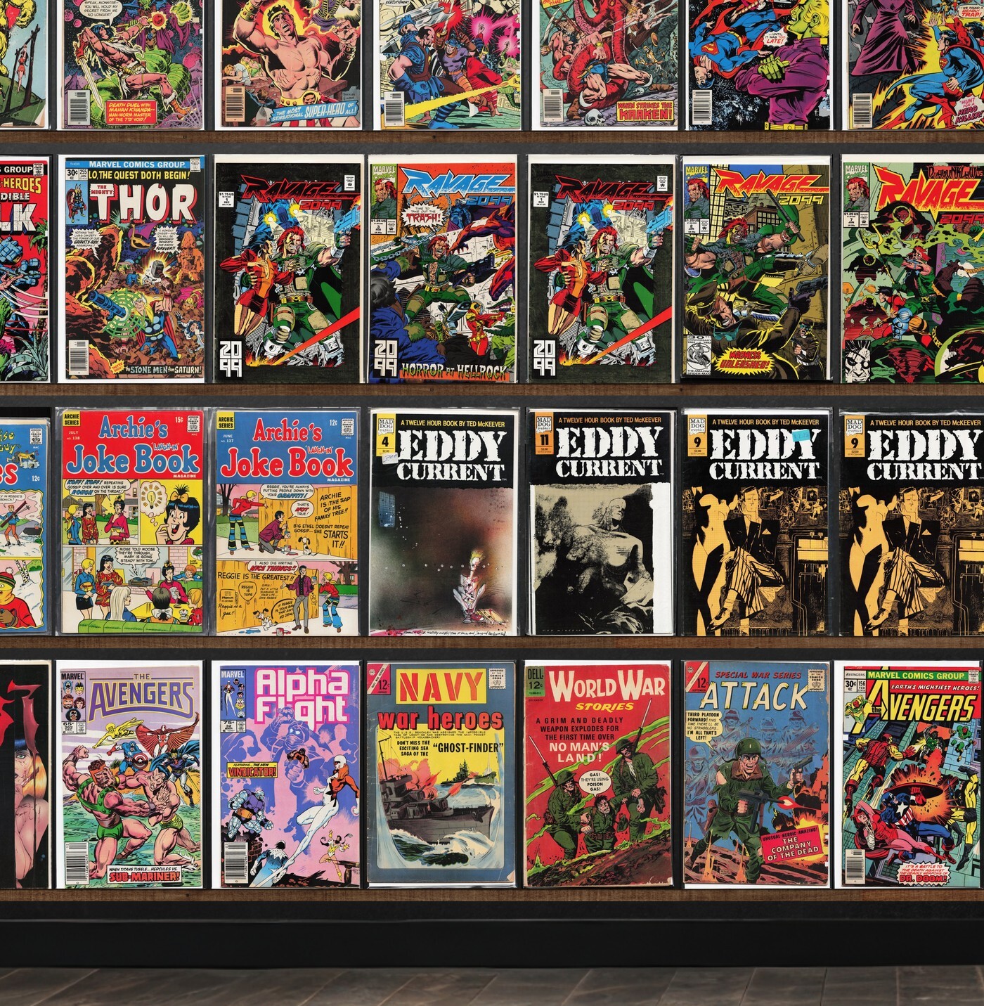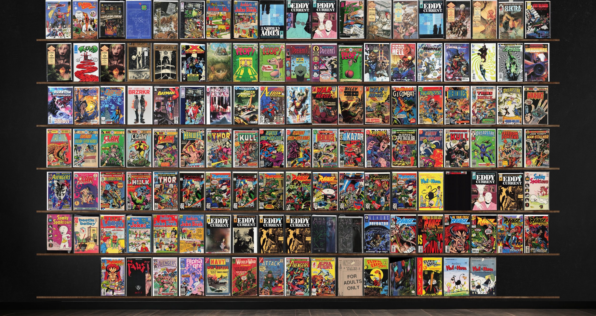 Ravage 2099, Eddy Current, Classics Illustrated, Superboy, Claw The Unconquered, Plop!, Hercules Unbound, The Avengers, Deathmate, Twilight, Dark Horse Presents, The Phantom Stranger, War Heroes, Dreadstar And Company, Thor, Kull The Destroyer, Spooky Spooktown, Black Orchid, Alpha Flight, Archie And Me, Atomic Age, Elektra: Assassin, Vic And Blood, Stupid (1993) Spewn, X-Factor, Threshold, Grayson, Green Lantern, Hardware: Season One, Quasar, Brzrkr, Batman, Beyond Real, Green Arrow, Action Comics, Billy The Kid, G.I. Combat, Warlord, Marvel Two In One, Man Bat, Beowulf, Ka Zar, Marvel Spectacular, Freedom Fighters, Targitt, Marvel Presents, Marvel Super Heroes, Beetle Bailey, Laugh, Navy War Heroes, World War Stories, Special War Series