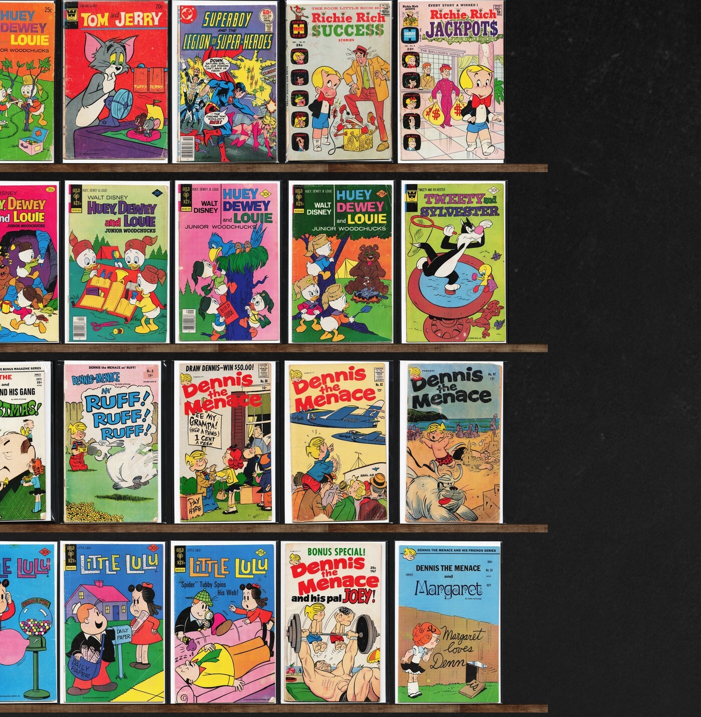 Tweety And Sylvester, Little Lulu, Dennis The Menace, Walt Disney Showcase, The Little Monsters, Richie Rich Gems, Scamp, Mickey Mouse, Marge'S Little Lulu, Richie Rich, Harbinger, Superboy, Richie Rich Fortunes, New Terrytoons (1977), Tom And Jerry, Richie Rich Jackpots, Little Dot, Nancy, Adventure Comics, Yogi Bear, Richie Rich Riches, Richie Rich Diamonds, New Terrytoons, Top Cat