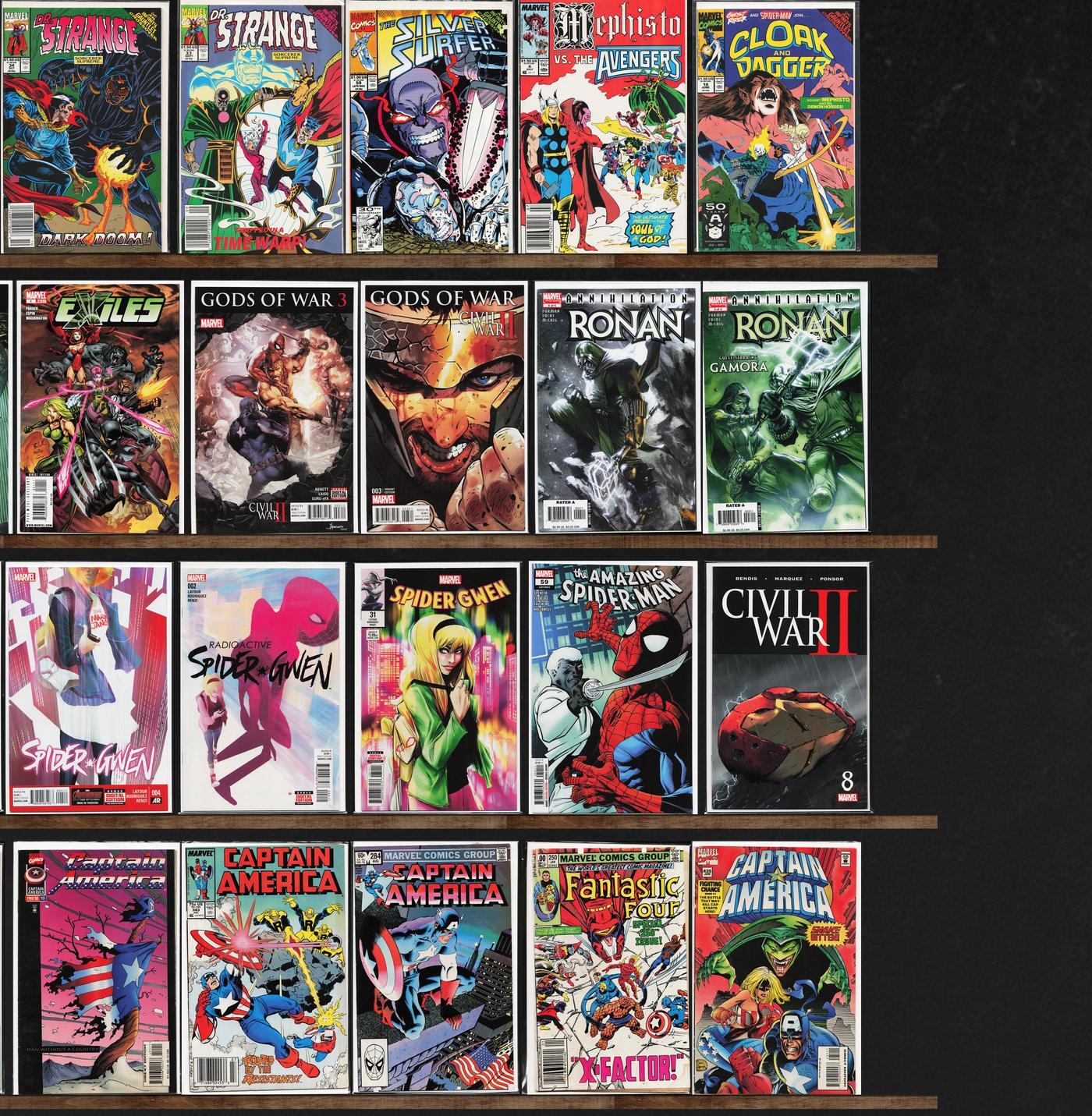 Captain America, Wolverine, Spider-Gwen, Silver Surfer, Thor, Web Of Spider-Man, Annihilation: Ronan, Civil War Ii, Age Of Heroes, Daredevil, The Amazing Spider-Man, Annihilation, Power Pack, Spider-Woman, Fantastic Four, Civil War, Mindset, Sleepwalker, Deathstroke The Terminator, Mephisto Vs. ..., Exiles, Marvel Knights Spider-Man, Darkhawk, The Unbelievable Gwenpool, Doctor Strange, Wolverine Max, Old Man Hawkeye, True Believers: Spider-Man