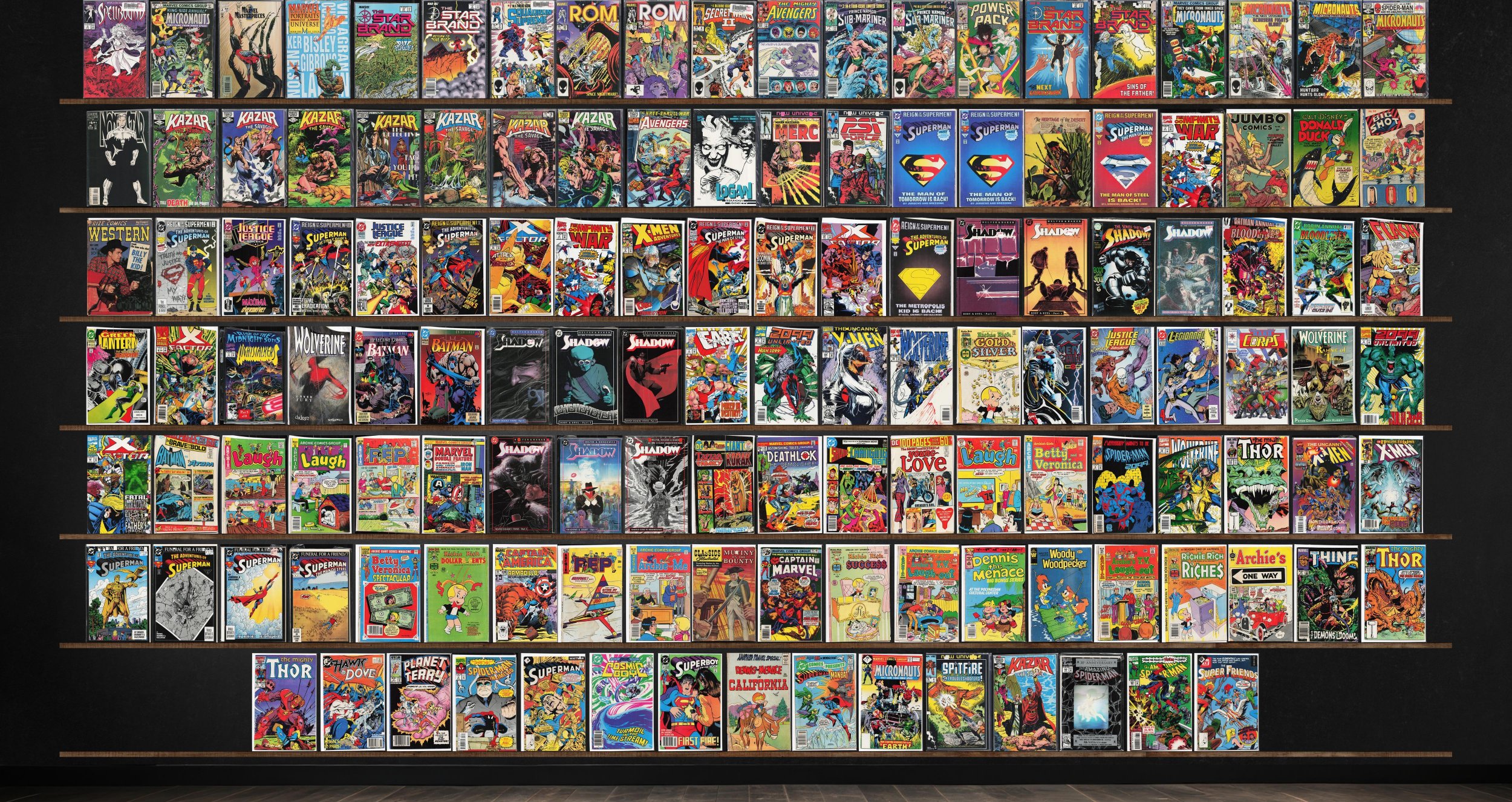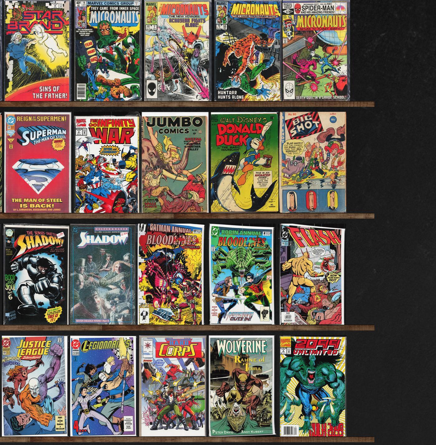 The Shadow, Ka Zar The Savage, Superman, Adventures Of Superman, The Star Brand, Micronauts, X-Factor, Laugh Comics, Thor, Rom, Four Color, The Infinity War, Justice League America, 2099 Unlimited, The Uncanny X-Men, Wolverine, Pep Comics, Archie'S Tv Laugh Out, The Amazing Spider-Man, Spellbound, Micronauts Annual, Marvels: Portraits, Squadron Supreme, Secret Wars Ii, The Avengers, Power Pack, Northstar, Mark Hazzard: Merc, Psi Force, Jumbo Comics, Big Shot Comics, Prize Comics Western, Action Comics, X-Men Adventures, Batman Annual, Robin Annual, The Flash, Green Lantern, X-Factor Annual, Nightstalkers, Detective Comics, Batman, Cable, X-Men Unlimited, Justice League International, Legionnaires, The H.A.R.D. Corps, Marvel Double Feature, Tarzan Family, Astonishing Tales, Young Love, Spider-Man 2099, X-Men, Captain America, Archie And Me, Classics Illustrated, Captain Marvel, Richie Rich Riches, The Thing, Hawk And Dove, Planet Terry, Spider-Man Unlimited, Cosmic Boy, Dc Comics Presents, Super Friends