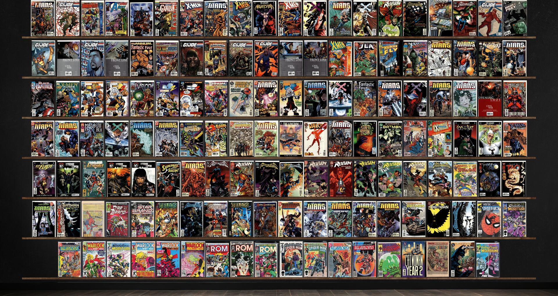 The Titans, Nightwing, G.I. Joe: Origins, Robin, J2, Earth X, Batman, Warlord, Rom, Magneto Rex, Valor, Rising Stars: Untouchable, Tellos, Strikeforce: Morituri, Captain America, Jla, The Human Fly, Deathstroke The Terminator, Black Panther, X-Men/Alpha Flight, Warlock, Birds Of Prey, Fantastic Four, Green Goblin, The Kingdom, Excalibur, Cyber Force, Superboy Plus, Marvel Tales, Spider-Girl, Lady Pendragon