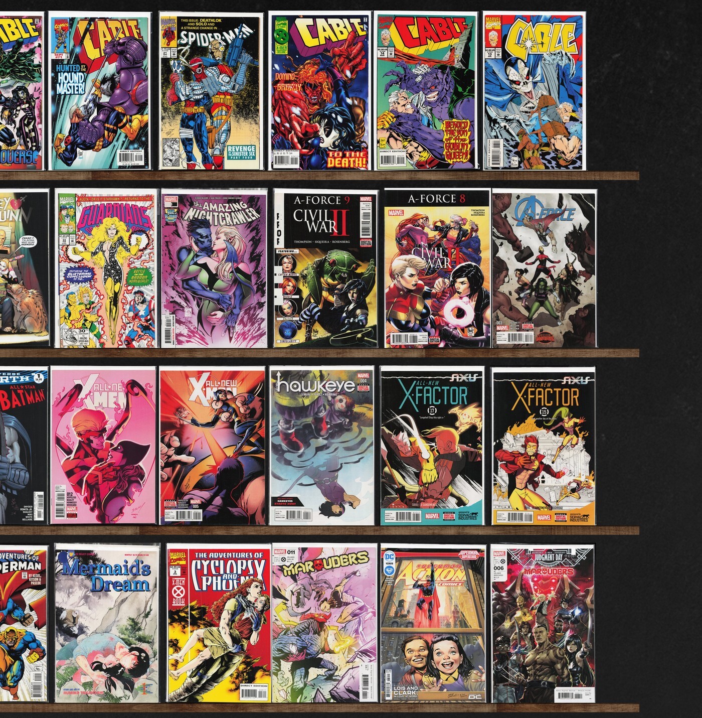 Action Comics, Cable, Harley Quinn, Silver Surfer, All New X-Men, Marauders, King Spawn, A Force, Mermaid'S Scar, Mermaid'S Promise, Magic, Green Lantern, All New, All Different Avengers, The Avengers, Green Arrow, Industrial Gothic, All New Hawkeye, All New X-Factor, Legion Of Super Heroes, The Night Man, Jon Sable, Freelance, Cyberforce/X-Men (2007) Cyberforce, Man Of War, Spider-Man, Green Lanterns, All Star Batman, All New Inhumans, Alienated, Alien Legion, Alan Robert'S Killogy, Mermaid'S Mask, Mermaid'S Gaze, Mermaid Forest, Adventures Of Superman, Mermaid'S Dream, Lunar Room, Lumberjanes, Grayson, L.E.G.I.O.N., Knight Terrors: Titans, Knight Terrors: Punchline, Kneel Before Zod, Kitsune, Batman Annual