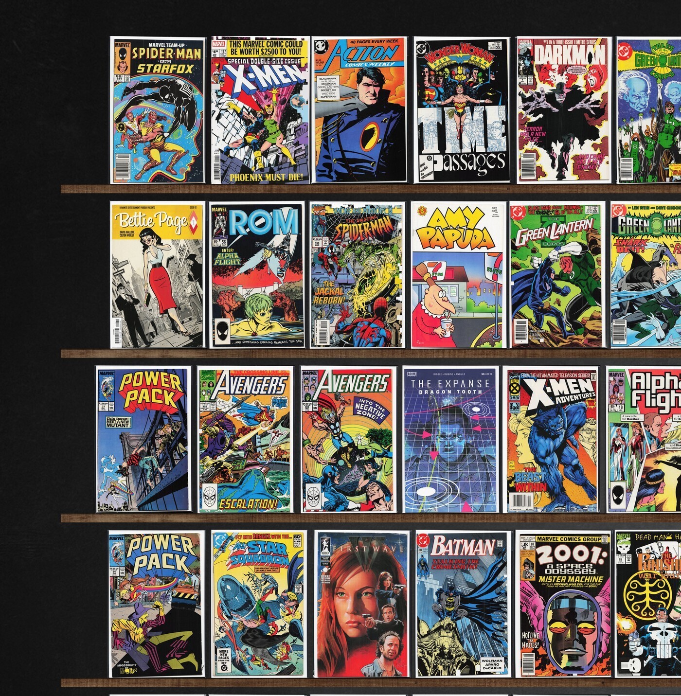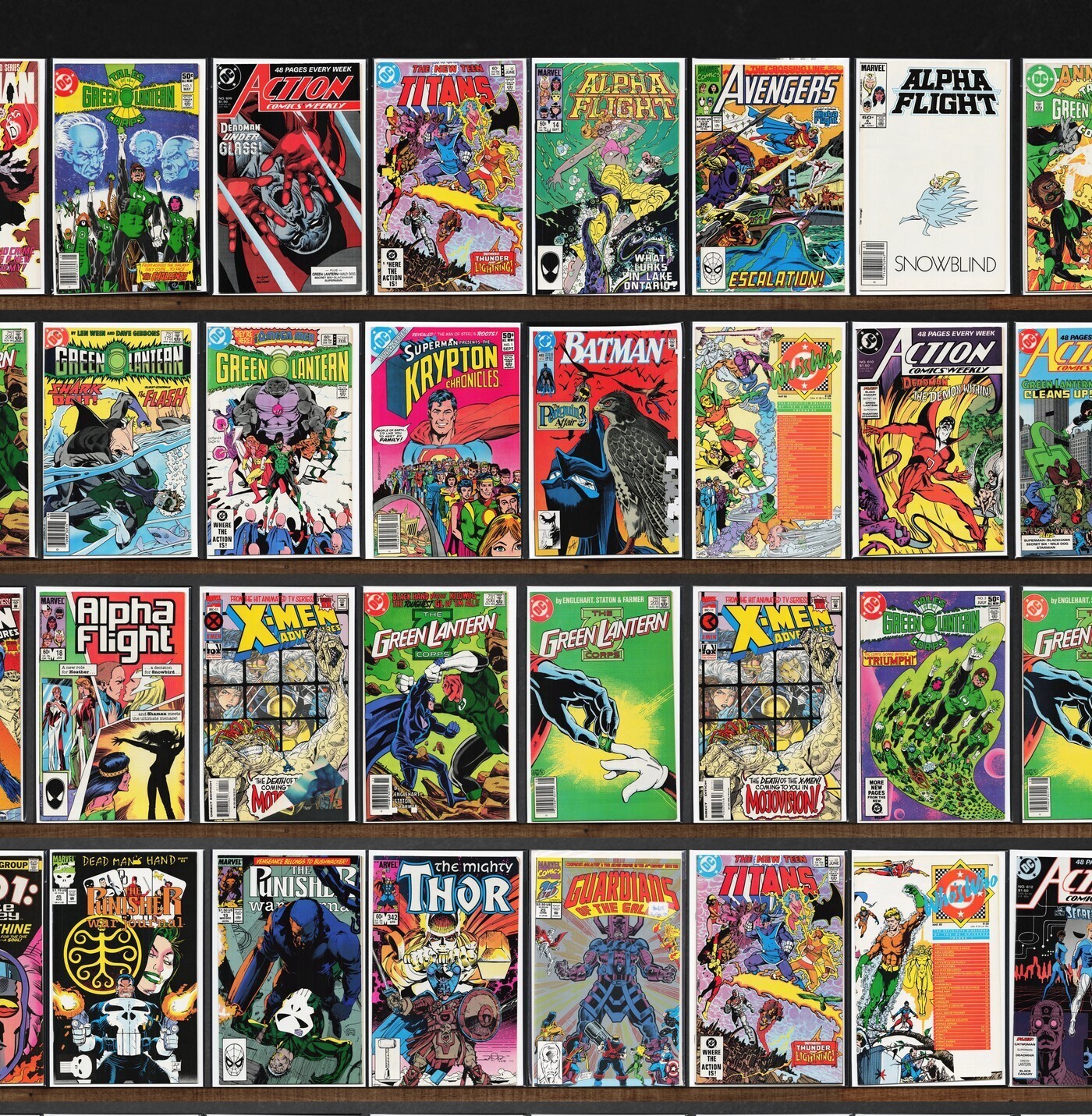 Action Comics Weekly, Green Lantern, Alpha Flight, The Avengers, Action Comics, Wonder Woman, Bettie Page, Batman, X-Men Adventures, Thor, Rom, The Expanse, Power Pack, Fantastic Four, Namor, The Sub Mariner, The Uncanny X-Men, Marvel Team Up, Darkman, The Omega Men, X-Force, The Amazing Spider-Man, Amy Papuda, Krypton Chronicles, Who&, Green Lantern Annual, What The ?!, All Star Squadron, X-Factor, Captain America, Super Soldiers, Starslayer, Daredevil, The Flash, Update '88