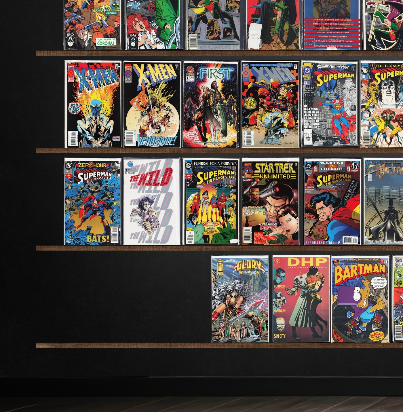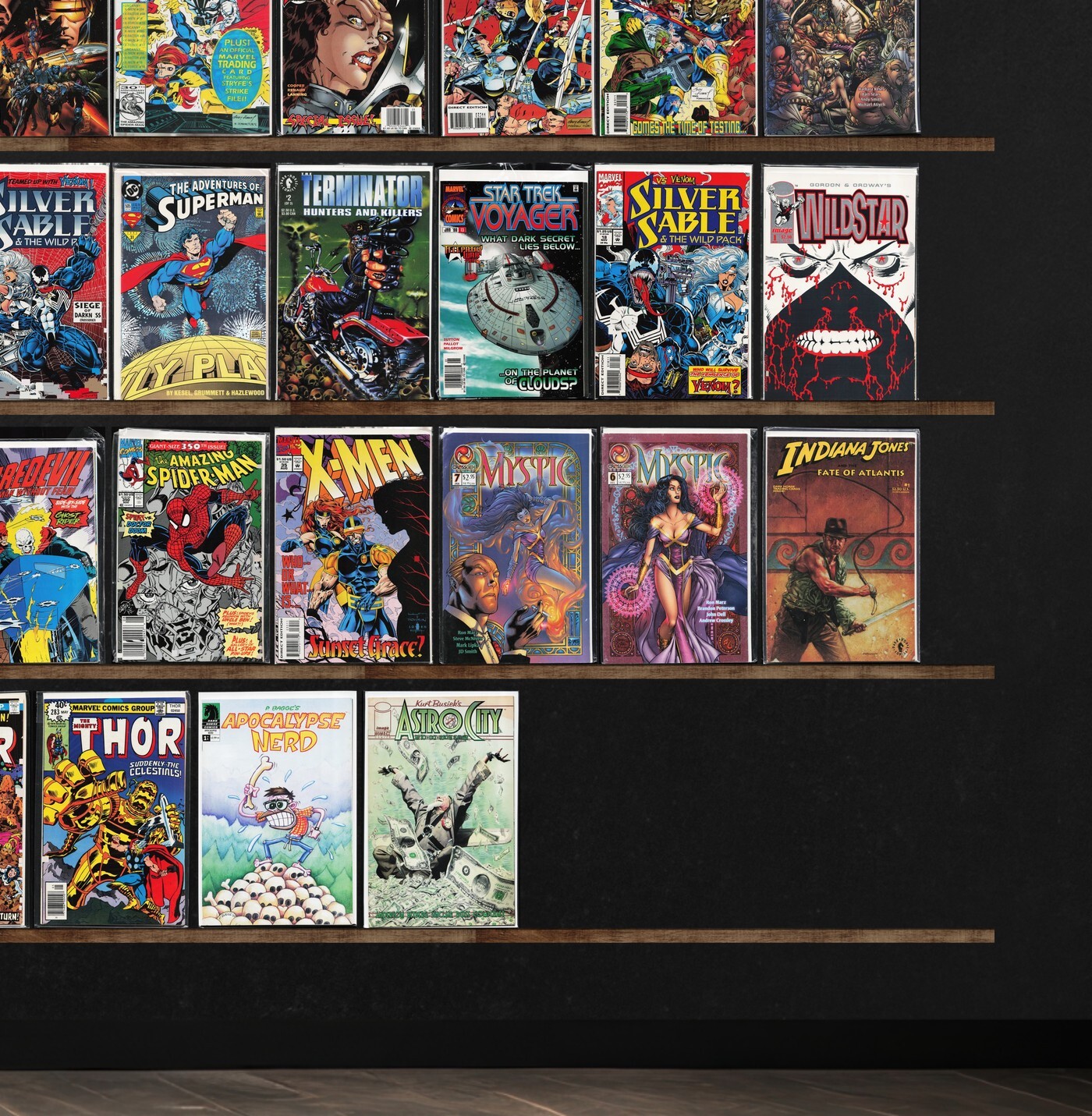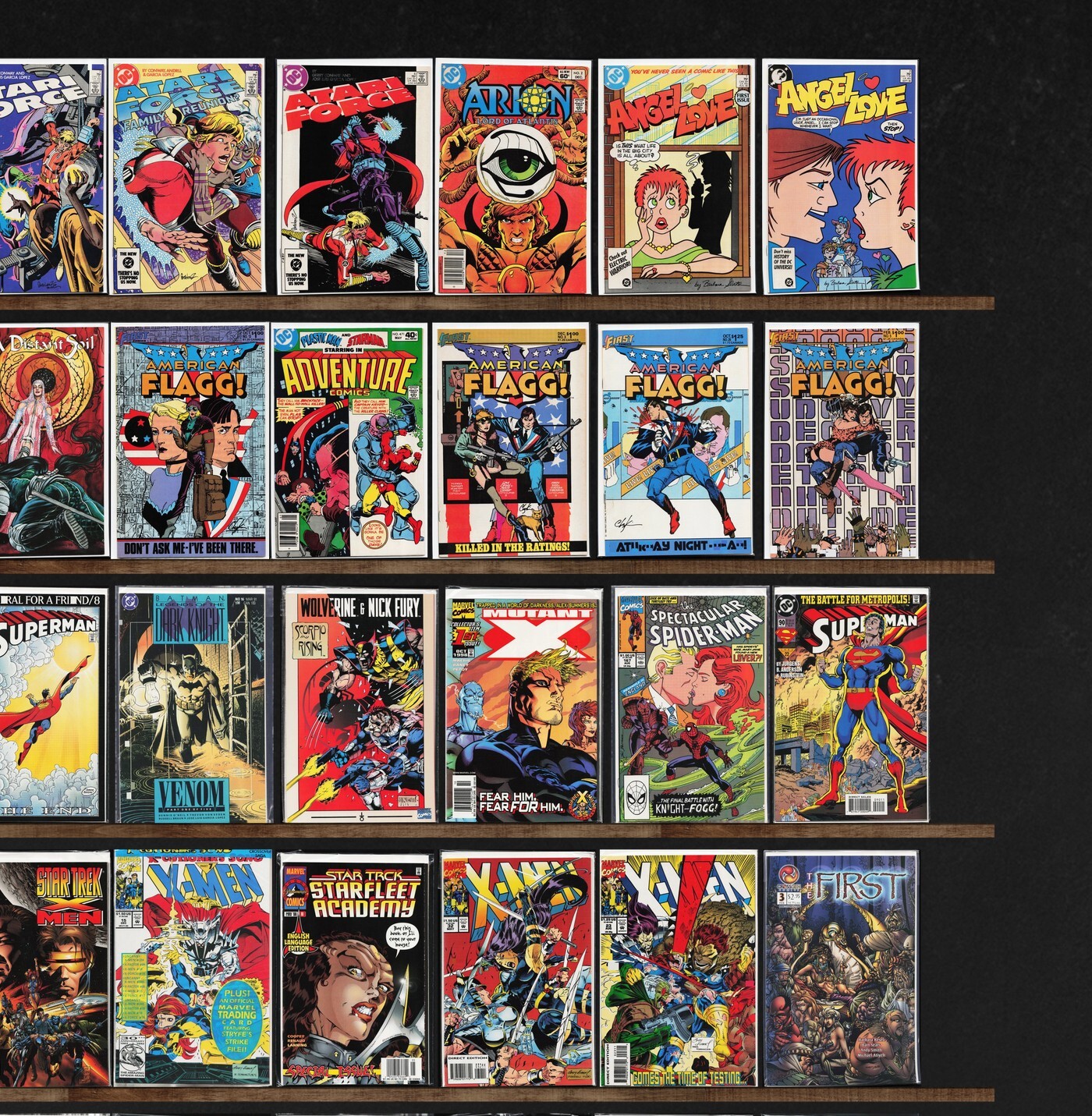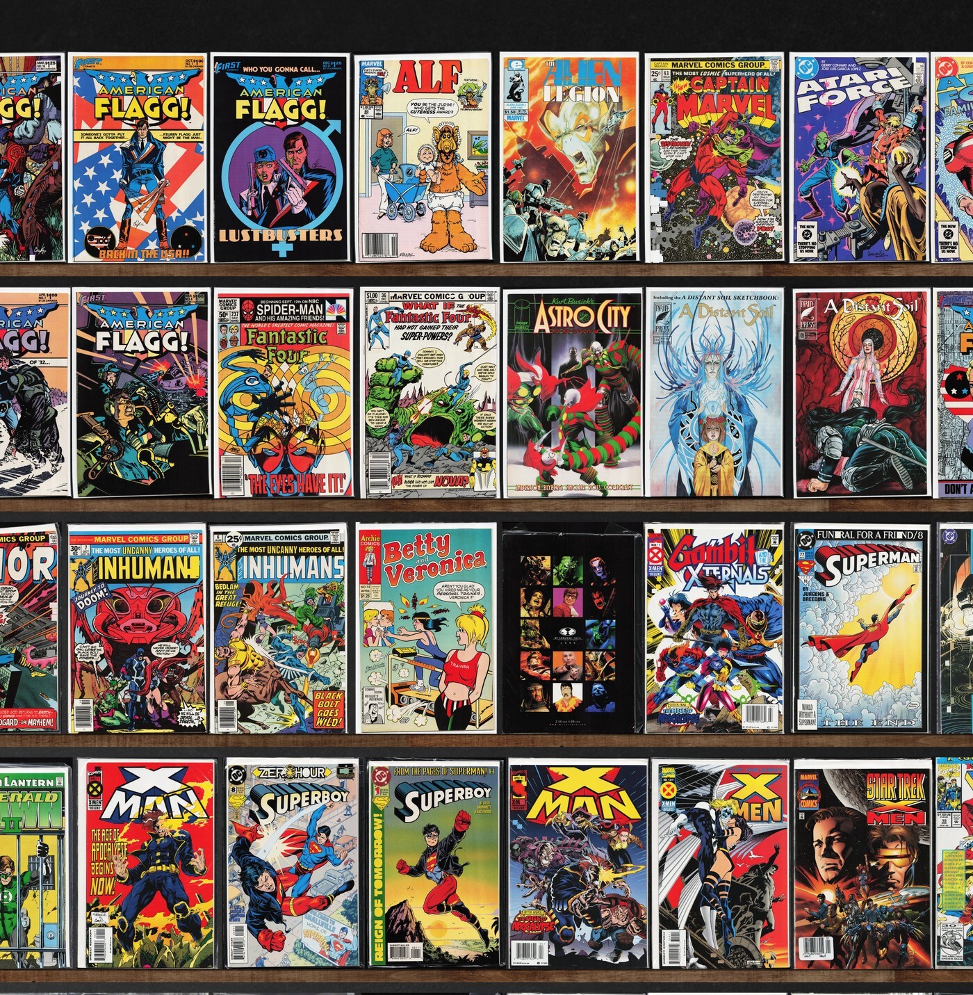 American Flagg!, X-Men, Thor, The Spectacular Spider-Man, Robin, The Uncanny X-Men, A Distant Soil, Alf, Atari Force, Ambush Bug, The Inhumans, Action Comics, Alien Legion, Angel Love, Adventure Comics, Superman, Web Of Spider-Man, X-Man, Superboy, The First, Batman, Adventures Of Superman, Star Trek: Voyager, Mystic, The Defenders, Captain Marvel, Fantastic Four, What If?, Kurt Busiek&, Captain America, Fantastic Four Annual, Betty And Veronica, Scorpio Rising (1994), Mutant X, Spider-Man 2099, Superman Annual, Ghost Rider, Wildstar: Sky Zero, Star Trek Unlimited, Marvel Comics Presents, Bloodstrike, Green Lantern, The Avengers, Cable, Crossgen Chronicles, Robocop, Daredevil, The Amazing Spider-Man, Glory, Dark Horse Presents, Bartman, Fantasy Masterpieces, Wolverine, Tribe, Lobo, Amazing X-Men, Apocalypse Nerd