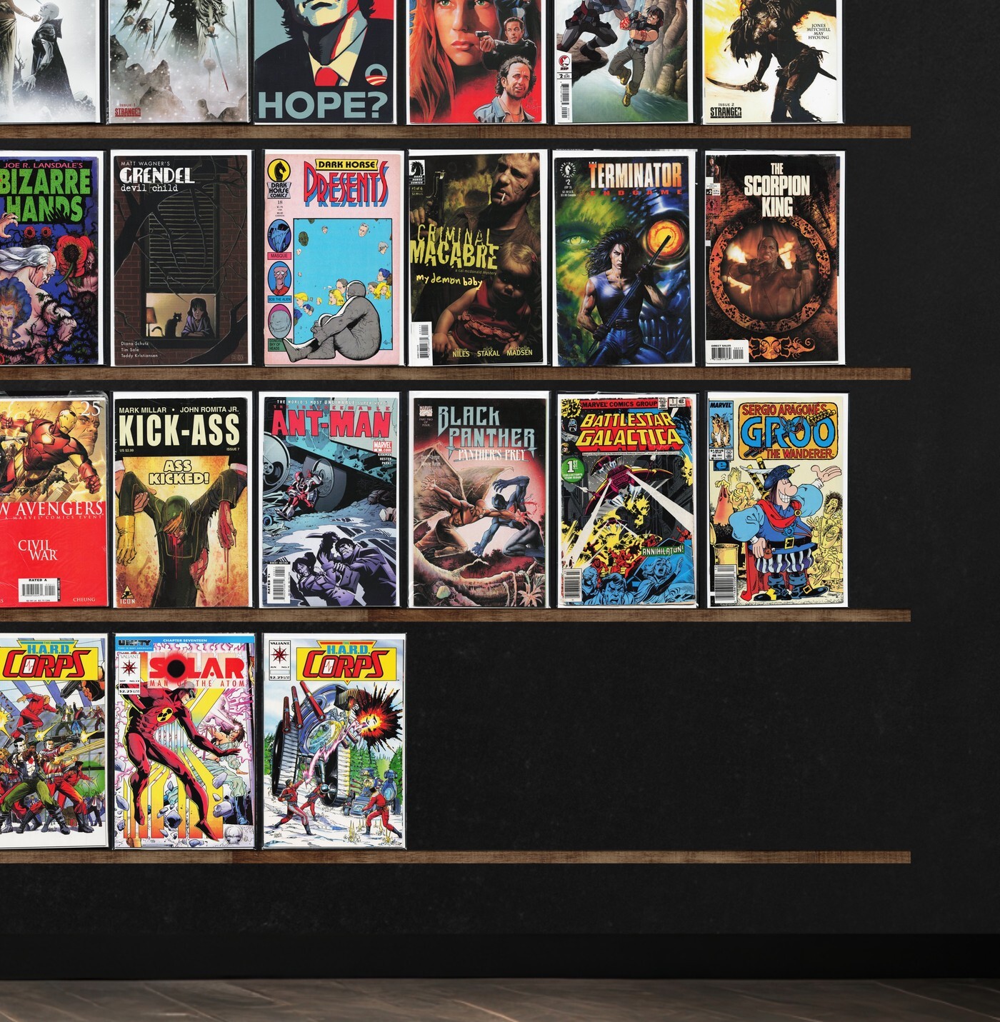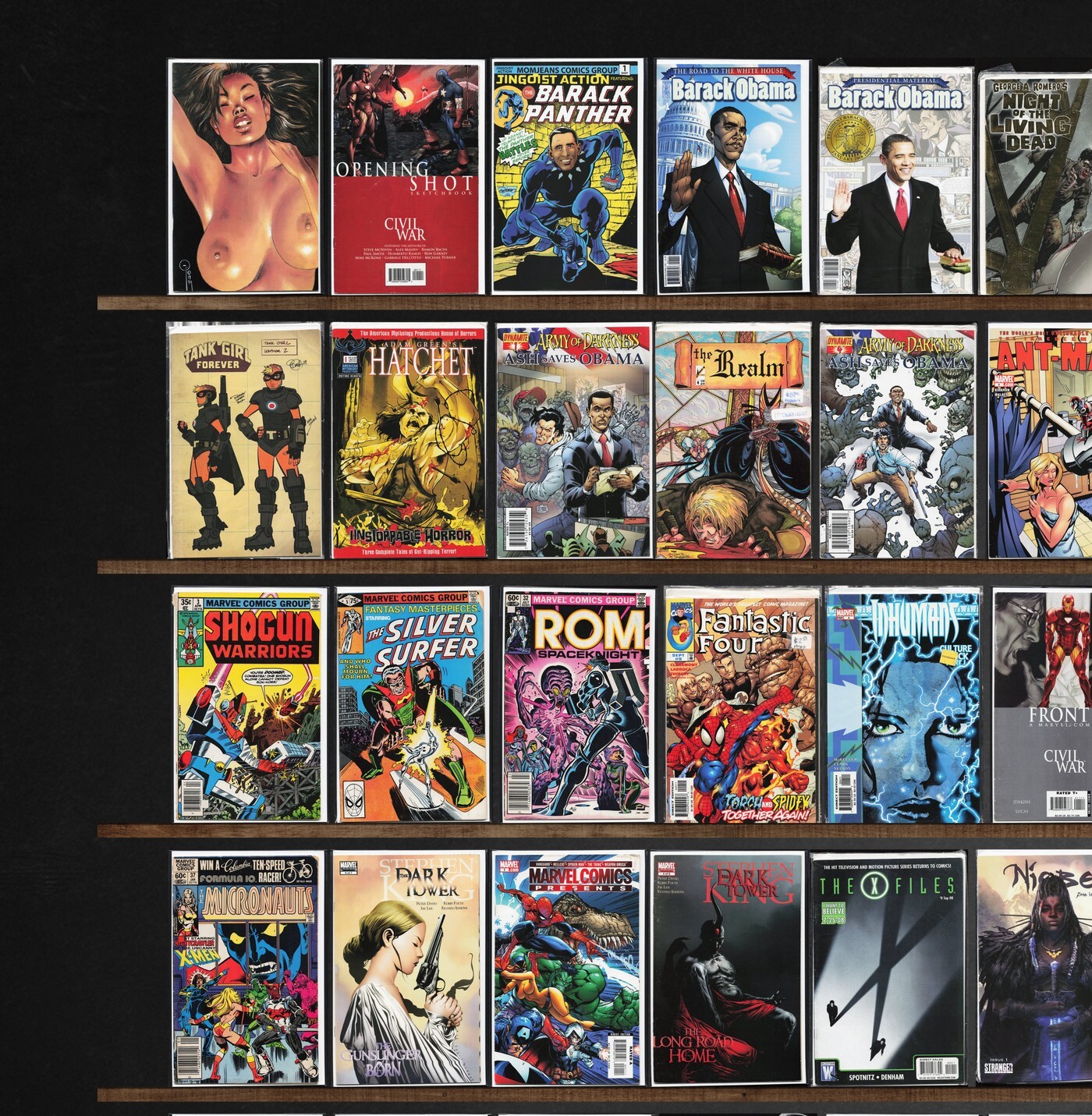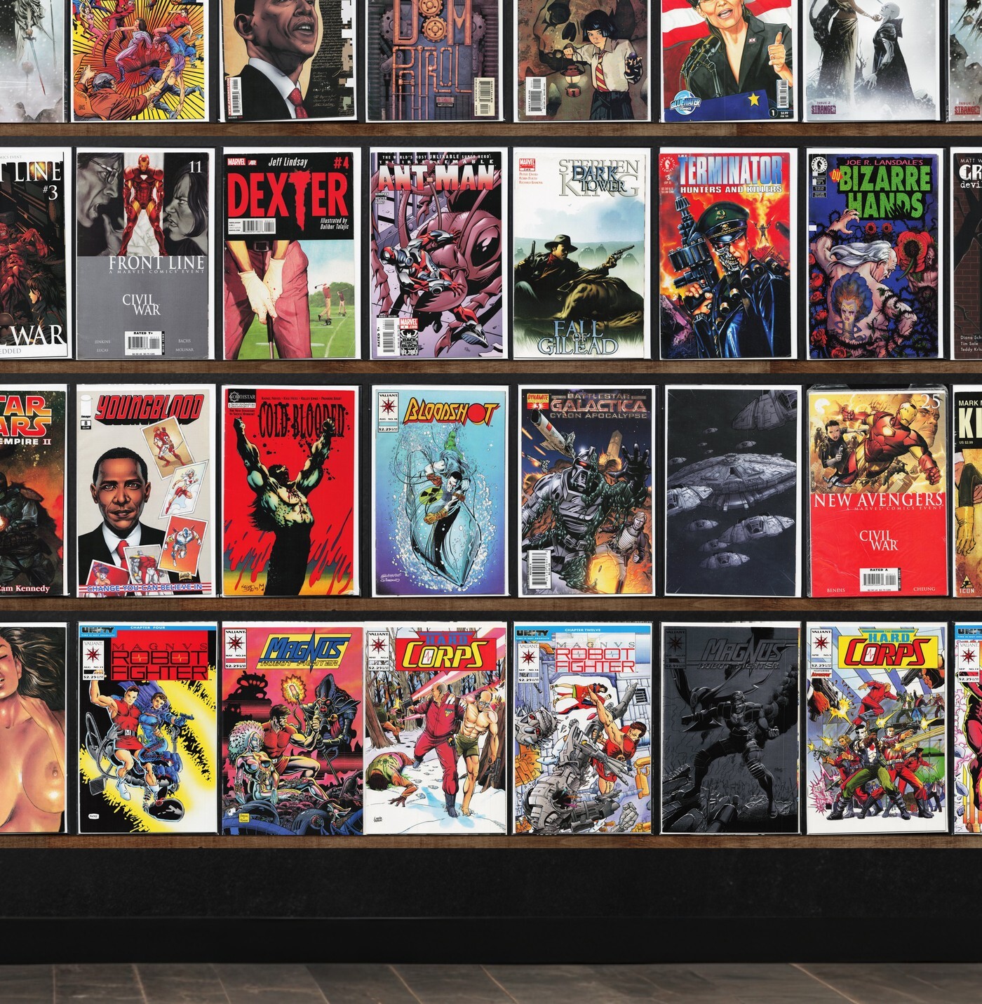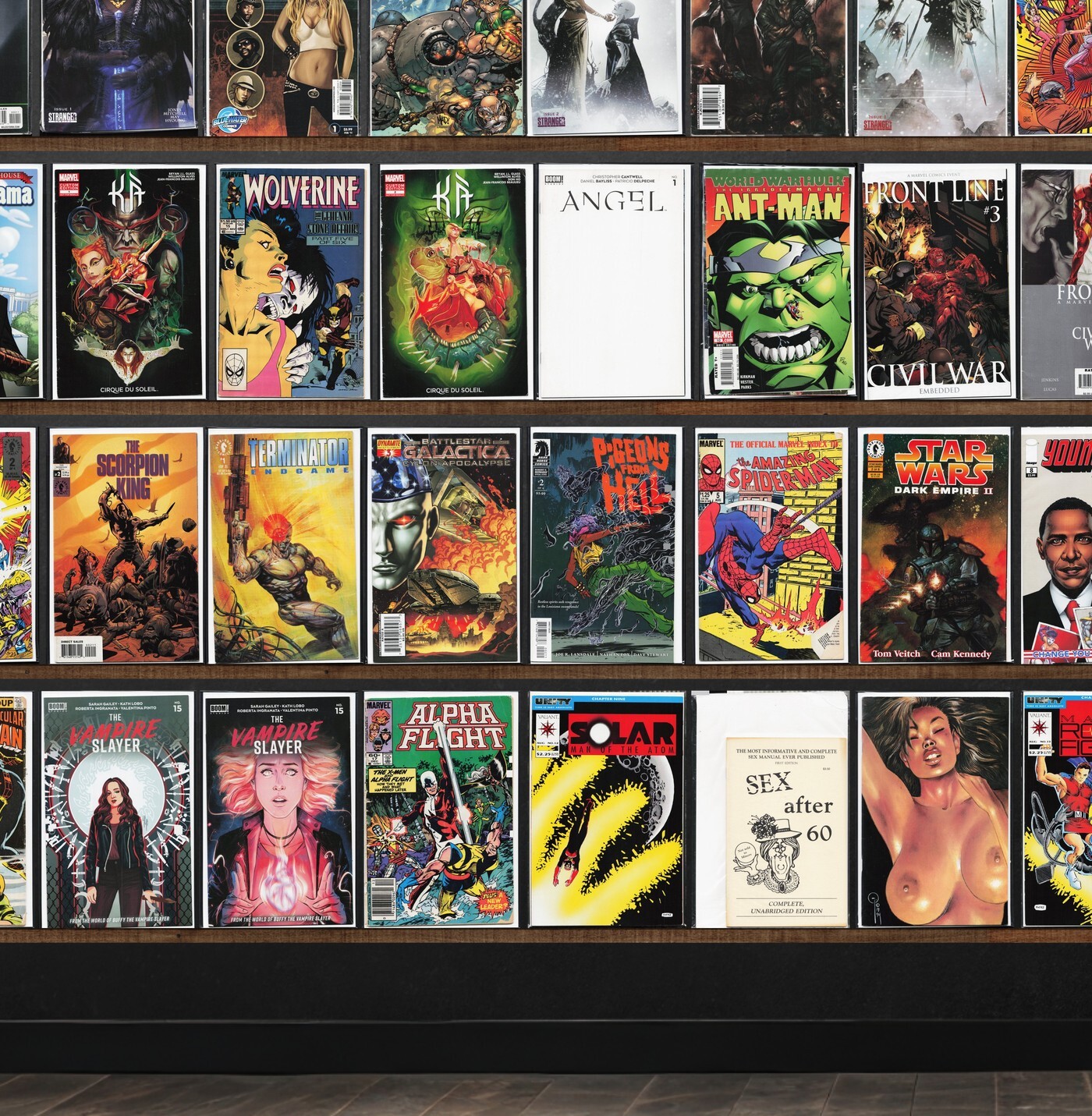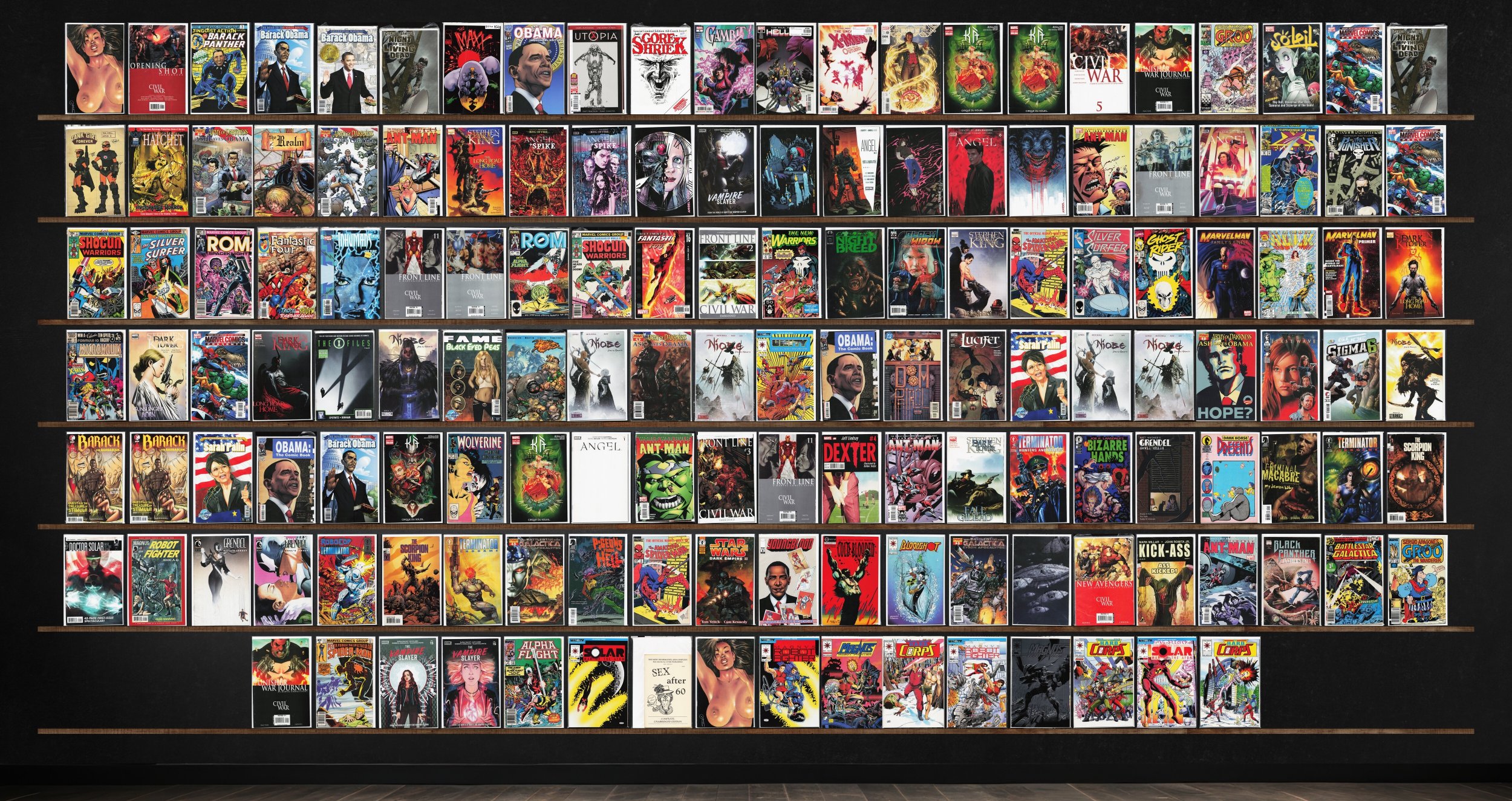Angel, The Irredeemable Ant Man, Angel + Spike, Magnus Robot Fighter, Marvel Comics Presents, The Vampire Slayer, The H.A.R.D. Corps, Exotica Lust (1992), Barack Obama, Punisher War Journal, Shogun Warriors, Rom, Barack The Barbarian, Terminator: Endgame, The Scorpion King, Grendel: Devil'S Legacy, Barack Panther (2018), The Maxx: Maxximized, Gore Shriek, Gambit, Hellions, Uncanny X-Men, Immortal X-Men, Kà, Civil War, Soleil Sampler (2008), Tank Girl, Realm, X-Factor, The Punisher, Fantasy Masterpieces, Fantastic Four, Inhumans, Ultimate Fantastic Four, The New Warriors, Silver Surfer, Ghost Rider, Marvelman Family'S Finest, The Incredible Hulk, Micronauts, X-Files, Fame: Lady Gaga, Battle Chasers, Unity, Doom Patrol, Lucifer, First Wave, Wolverine, Ka, Dexter, Dark Horse Insider, By Bizarre Hands, Grendel: Devil Child, Dark Horse Presents, Battlestar Galactica: Ghosts, Pigeons From Hell, Youngblood, Cold Blooded, Bloodshot, New Avengers, Kick Ass, Battlestar Galactica, The Spectacular Spider-Man, Alpha Flight