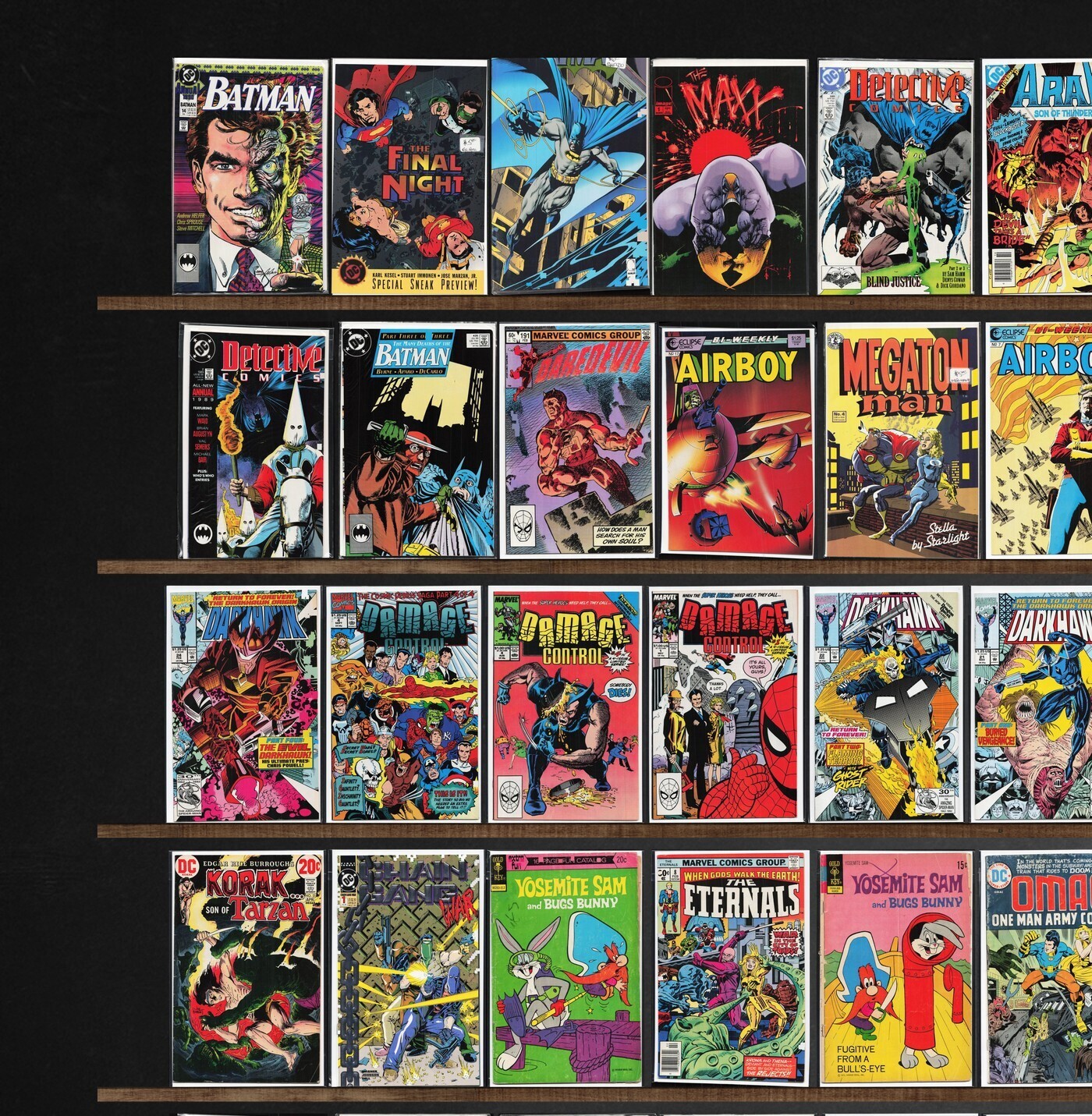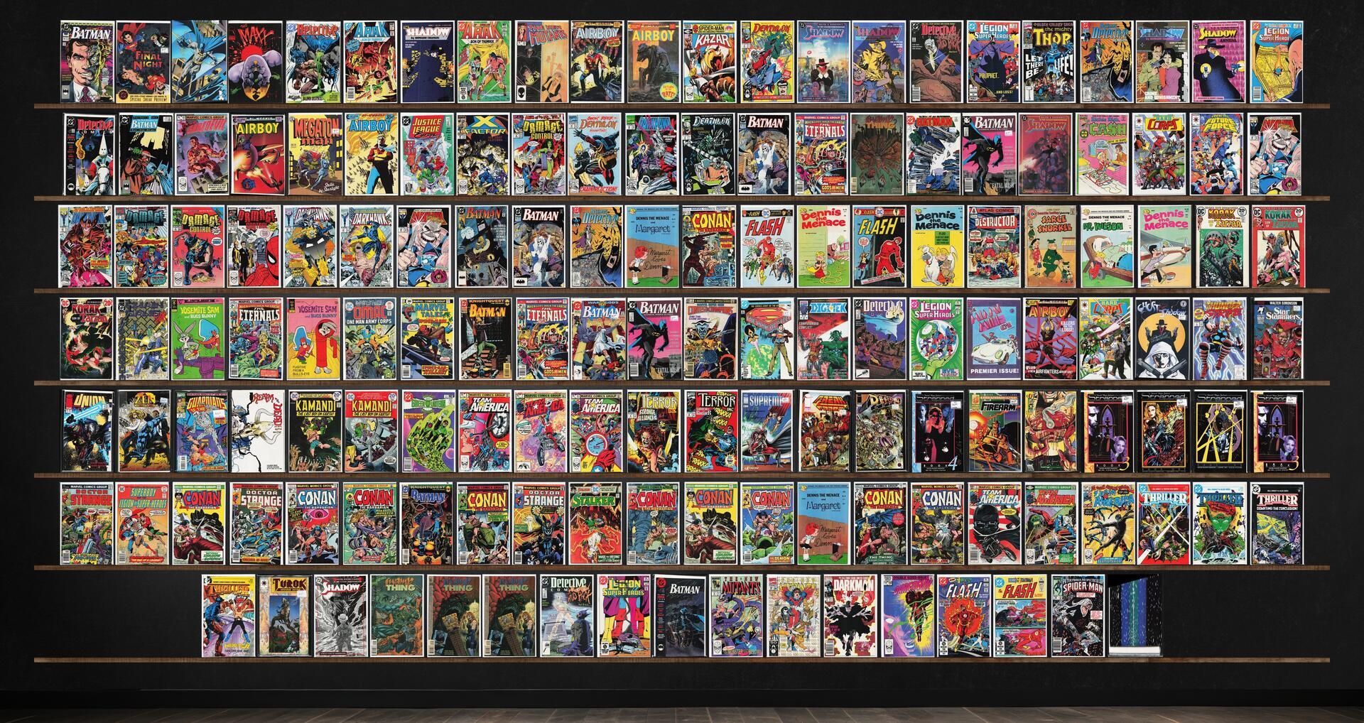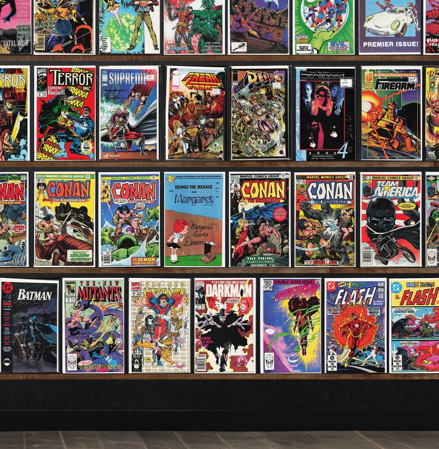 Batman, Conan The Barbarian, Detective Comics, The Shadow, Darkhawk, Team America, Airboy, Legion Of Super Heroes, Damage Control, Swamp Thing, The Flash, Strapped (1994), Thriller, The New Mutants, Deathlok, The Eternals, Dennis The Menace, Doctor Strange, Batman Annual, Daredevil, The H.A.R.D. Corps, Terror Inc., The Final Night, The Maxx, Ka Zar The Savage, The Mighty Thor, The Shadow Annual, Detective Comics Annual, Megaton Man, Justice League Europe, X-Factor, Richie Rich Cash, Rai, Destructor, Chain Gang War, Omac, Marvel Tales, Digitek, Miami Mice Comic, Thunderstrike, Star Slammers, Union, Supreme (1993), Freak Force, Defcon 4, Firearm, Protectors, Strapped (1995), Superboy, Stalker, Turok, Dinosaur Hunter, Darkman, The Spectacular Spider-Man