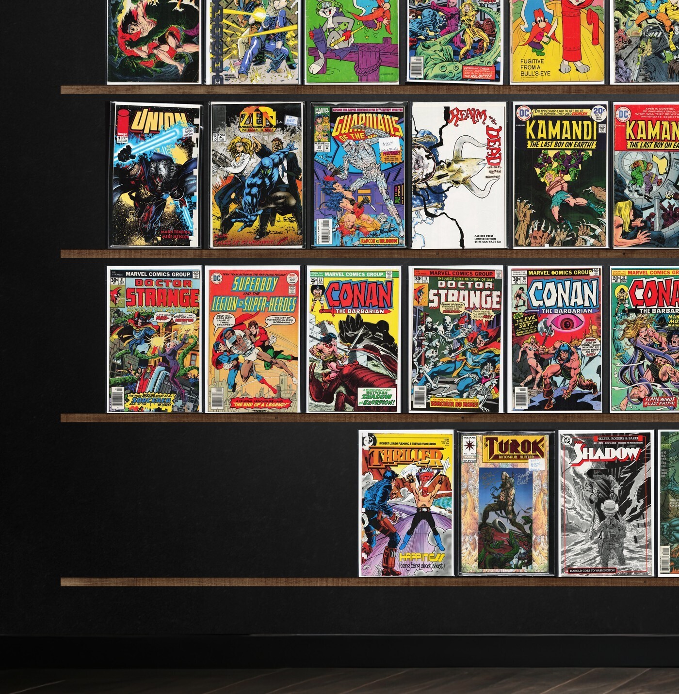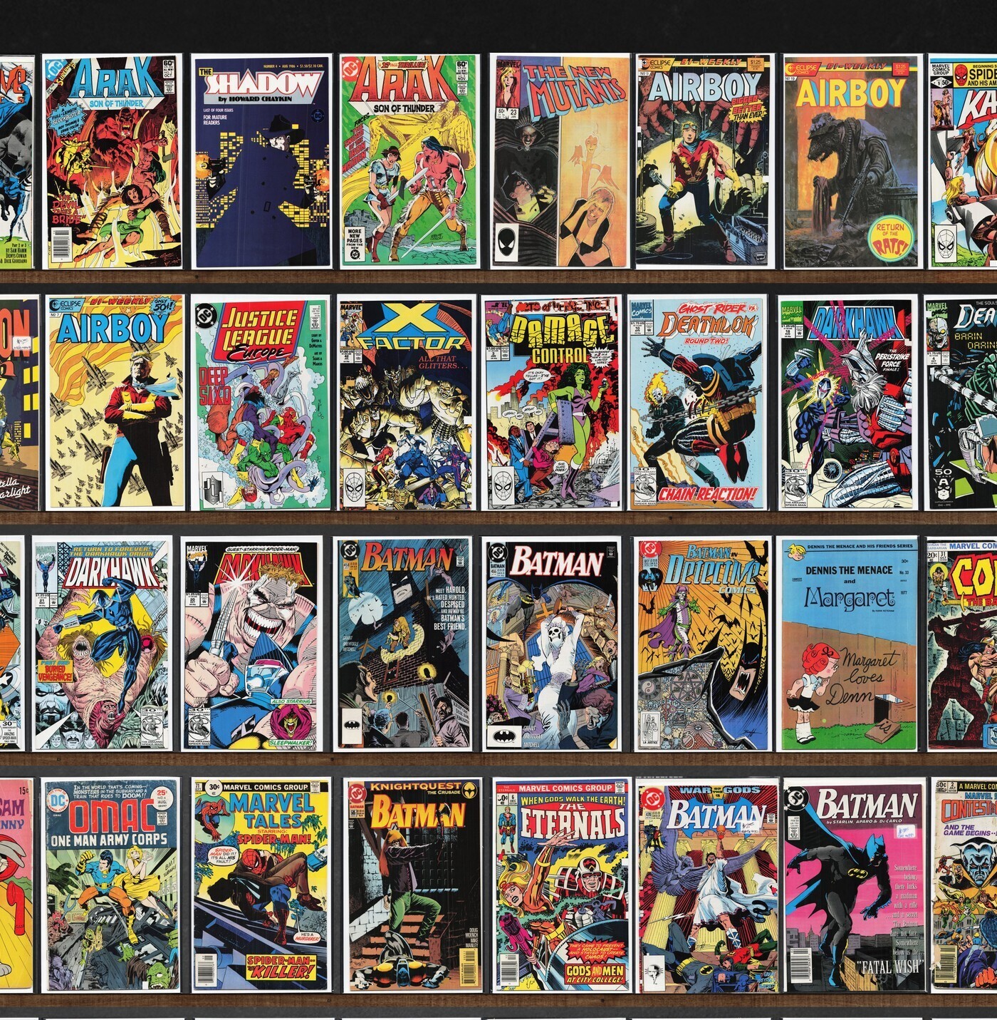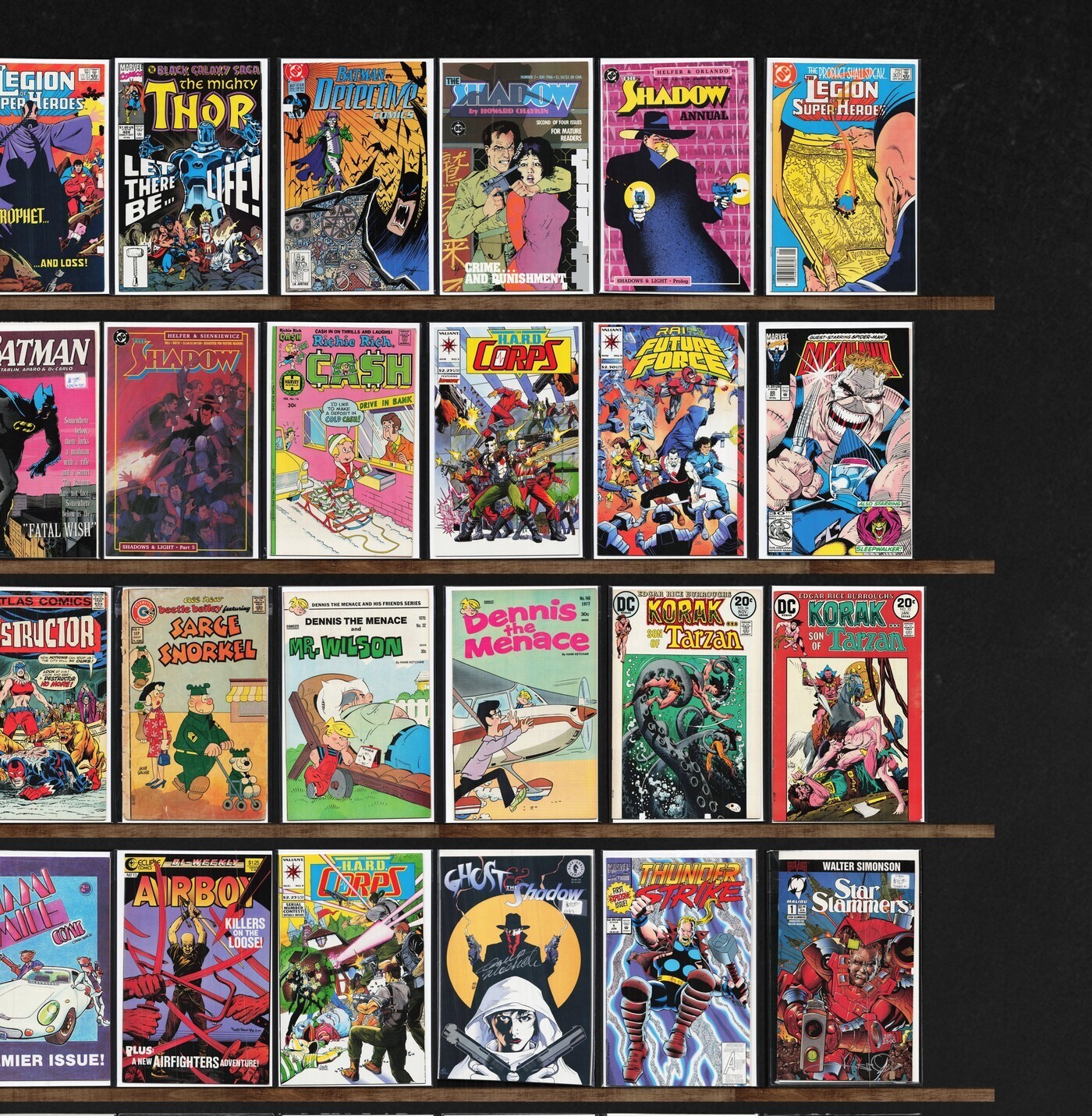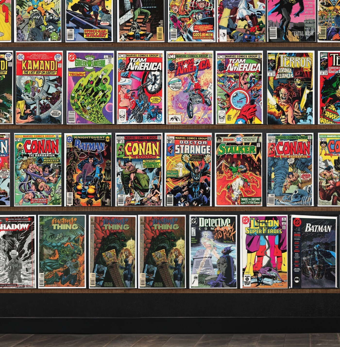 Batman, Conan The Barbarian, Detective Comics, The Shadow, Darkhawk, Team America, Airboy, Legion Of Super Heroes, Damage Control, Swamp Thing, The Flash, Strapped (1994), Thriller, The New Mutants, Deathlok, The Eternals, Dennis The Menace, Doctor Strange, Batman Annual, Daredevil, The H.A.R.D. Corps, Terror Inc., The Final Night, The Maxx, Ka Zar The Savage, The Mighty Thor, The Shadow Annual, Detective Comics Annual, Megaton Man, Justice League Europe, X-Factor, Richie Rich Cash, Rai, Destructor, Chain Gang War, Omac, Marvel Tales, Digitek, Miami Mice Comic, Thunderstrike, Star Slammers, Union, Supreme (1993), Freak Force, Defcon 4, Firearm, Protectors, Strapped (1995), Superboy, Stalker, Turok, Dinosaur Hunter, Darkman, The Spectacular Spider-Man
