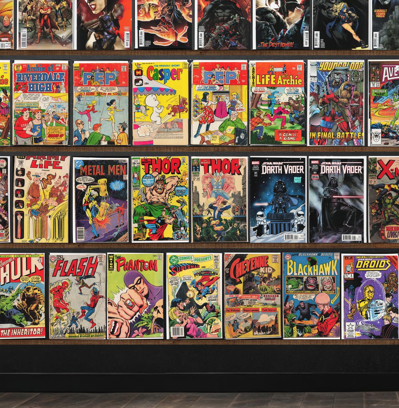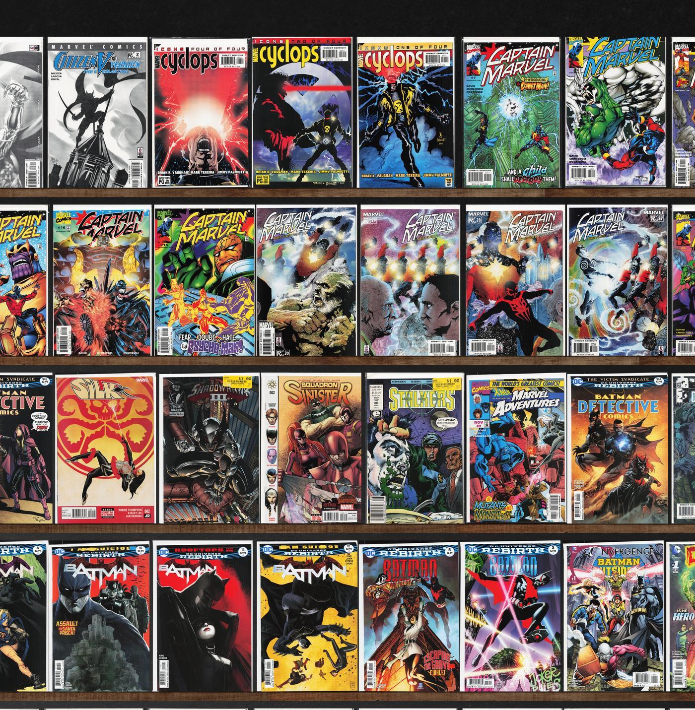 Captain Marvel, Batman, Detective Comics, Batman Beyond, Cyclops, Squadron Sinister, Metal Men, The Incredible Hulk, The Shadow, Life With Archie, Pep Comics, Thor, Darth Vader, Daredevil/Shi (1997) Shi, Daredevil Annual, Captain Marvel (1994), Daredevil: Ninja, Squadron Supreme, Silk, Shadowhawk Iii, Stalkers, Marvel Adventures, District X, Doomed, Youngblood, The Avengers, Fantastic Four, Harbinger, Saga, The Squidder, Birthright, Men Of Wrath, Star Wars, Descender, The Eternals, The Uncanny X-Men, Super Team Family, The X-Men, Green Lantern, Strange Tales, Marvel Two In One, Marvel Triple Action, Marvel Team Up, Marvel Tales, Man Thing, Mandrake The Magician, The Flash, Dupe, Dc Comics Presents, Cheyenne Kid, Blackhawk, Droids